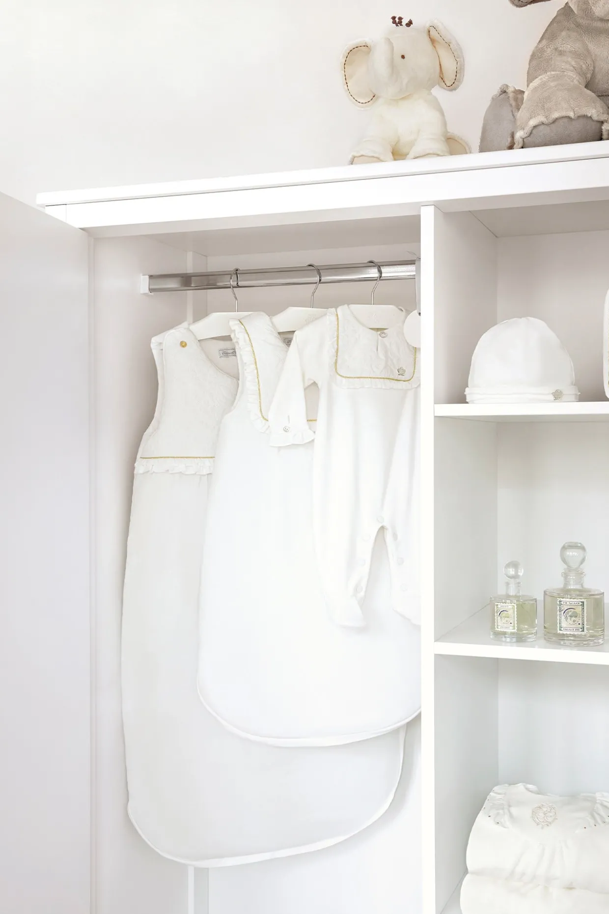 Bonnet Délicatesse nacre, en percale de coton émérisée. La ligne Délicatesse : Le raffinement et l’élégance de cette ligne illuminent l’univers féérique de la petite fille. Plastron en percale brodée, fils d’or et signature nacrée réhaussent avec modernité les lignes épurées de cette collection. Composition: 100% coton