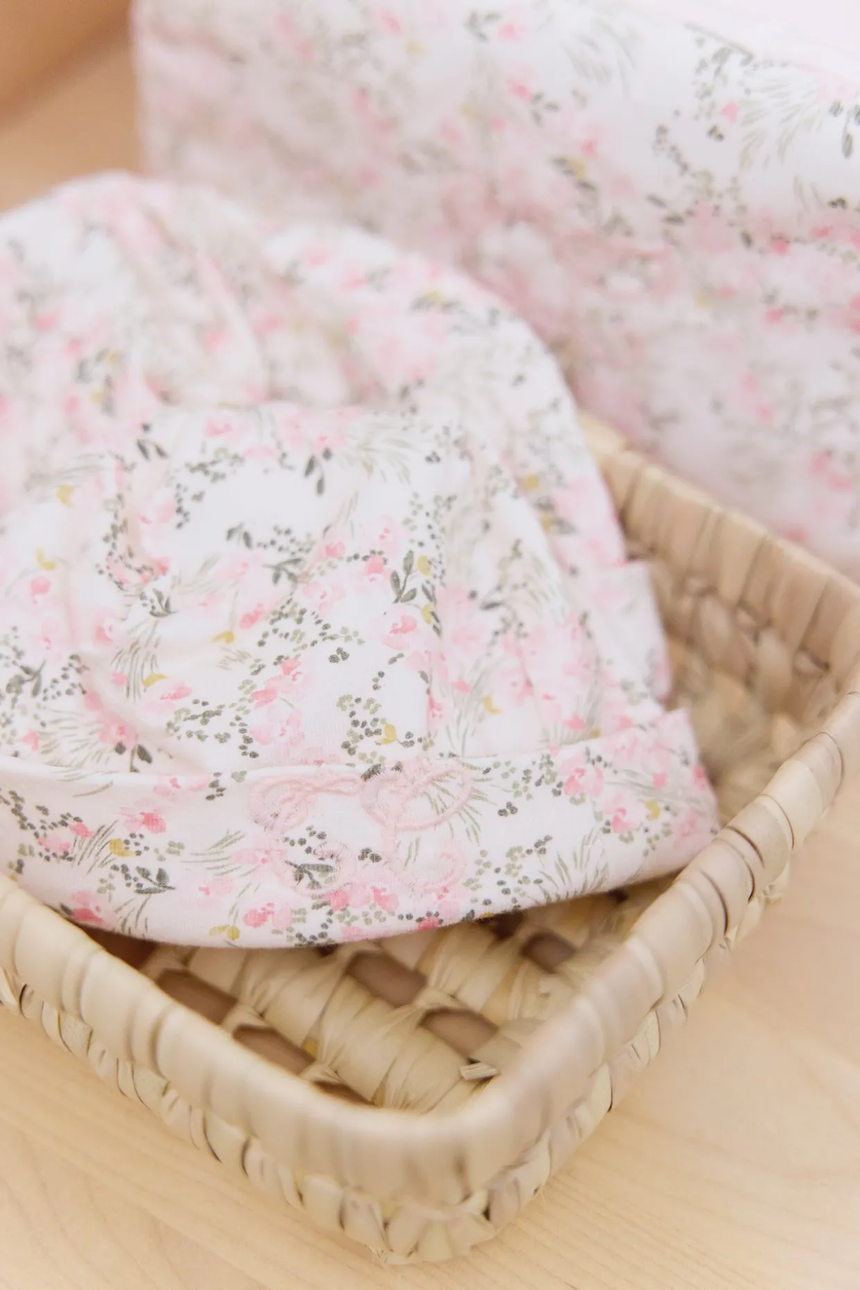 Bonnet en jersey imprimé fleuri inspiré d’un Jardin Hivernal, assorti au pyjama du thème Jardin Hivernal.