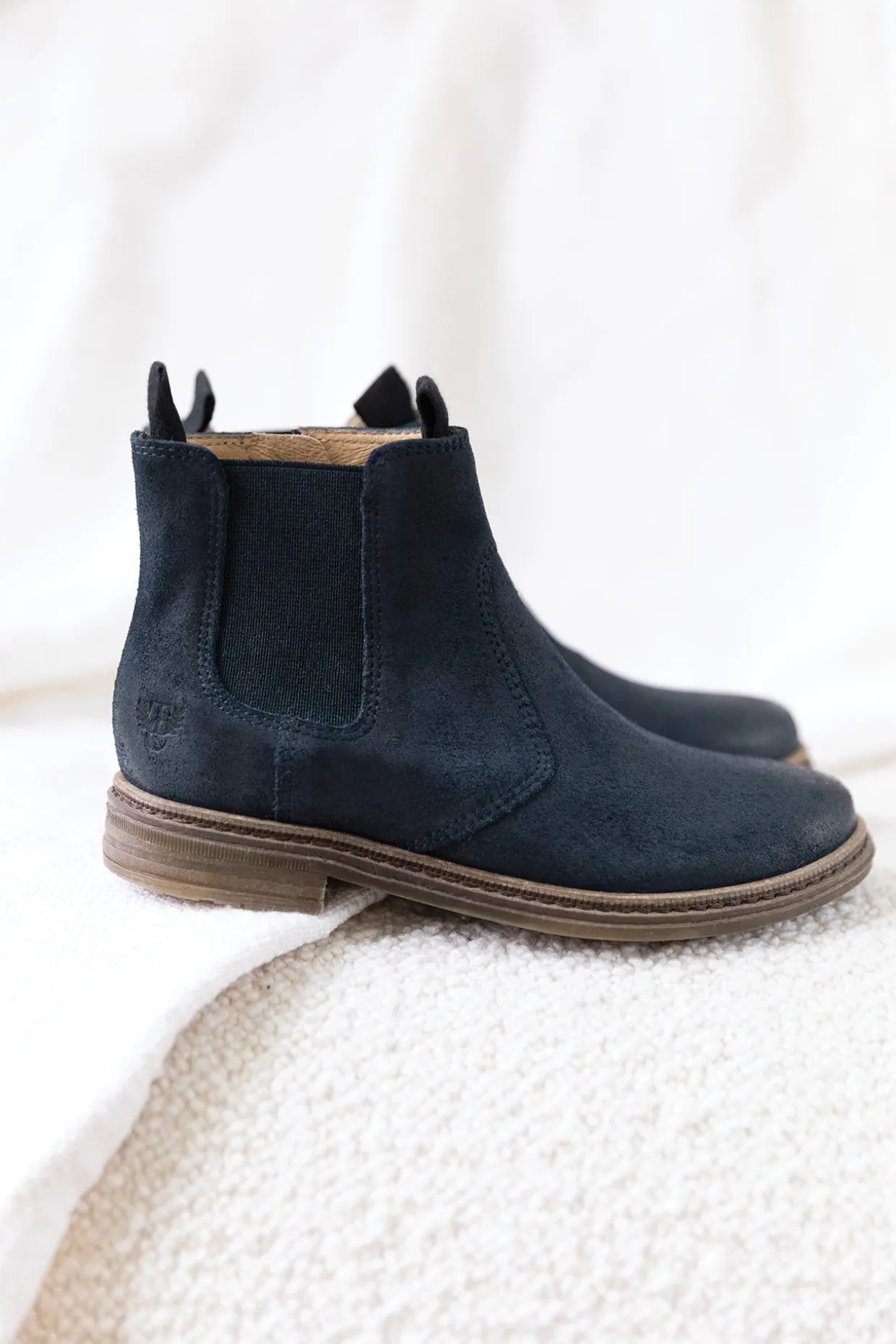 Ces bottines pour enfants sont présentées dans une version en cuir velours bleu marine. Elles sont conçues avec des matériaux de qualité pour le bon développement du pied et l’apprentissage de la marche. Elles se chaussent facilement grâce à un zip intérieur auto bloquant et un élastique de souplesse permettant un bon ajustement et un maintien de la cheville.