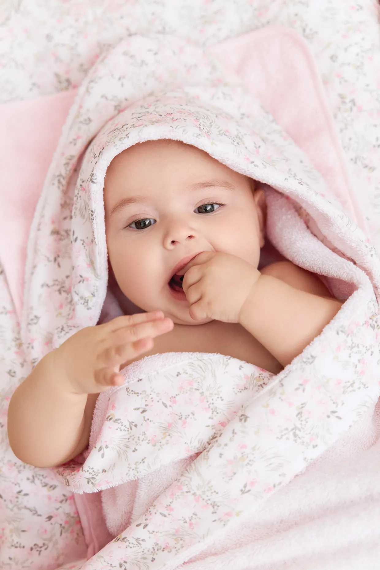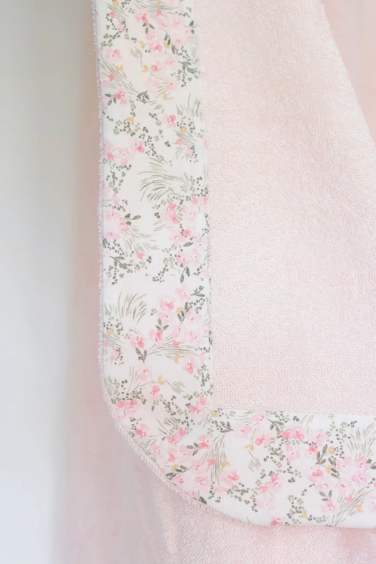 Cape de bain rose pâle imprimé fleuri inspiré d’un Jardin Hivernal. Confectionnée en coton lange et éponge, elle allie douceur, absorption et raffinement pour les moments de tendresse après le bain. Dimensions : 70 x 70 cm.