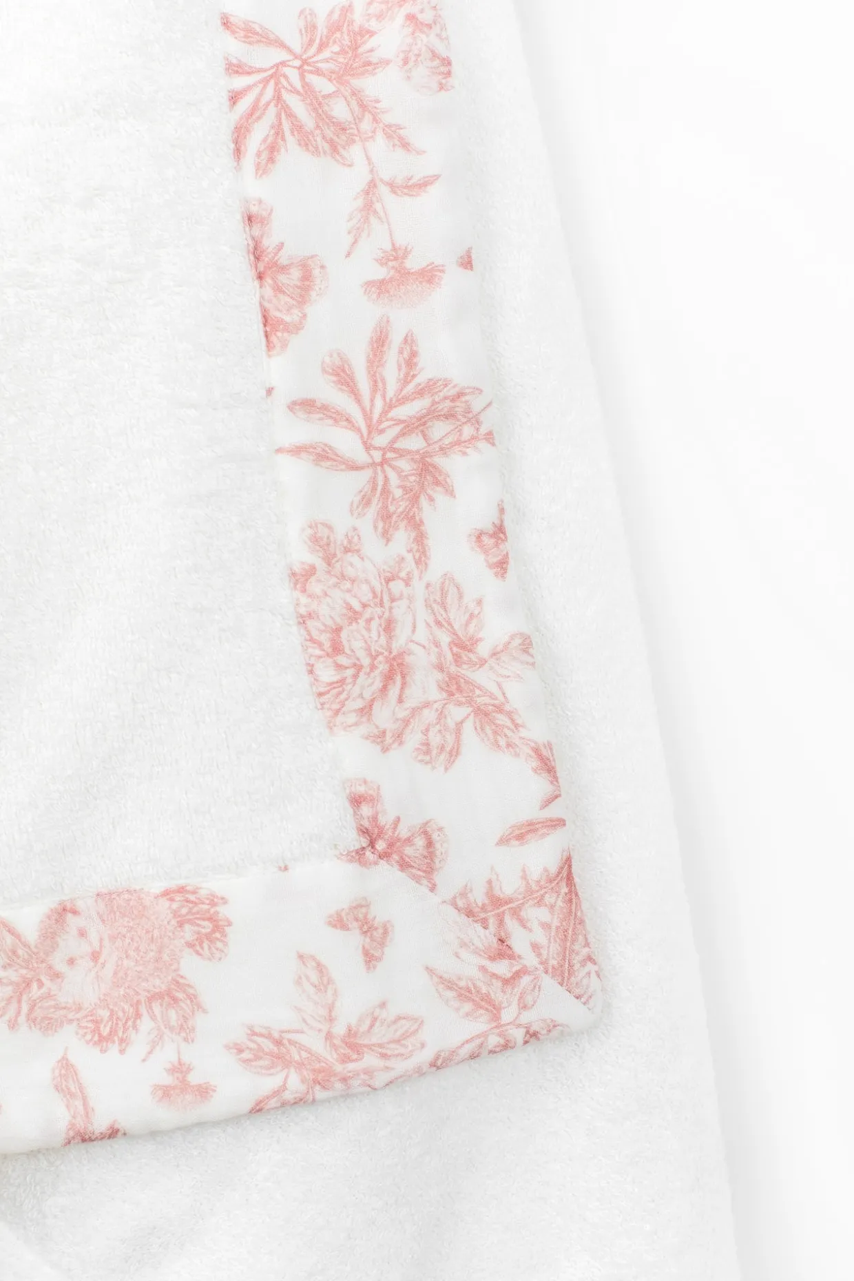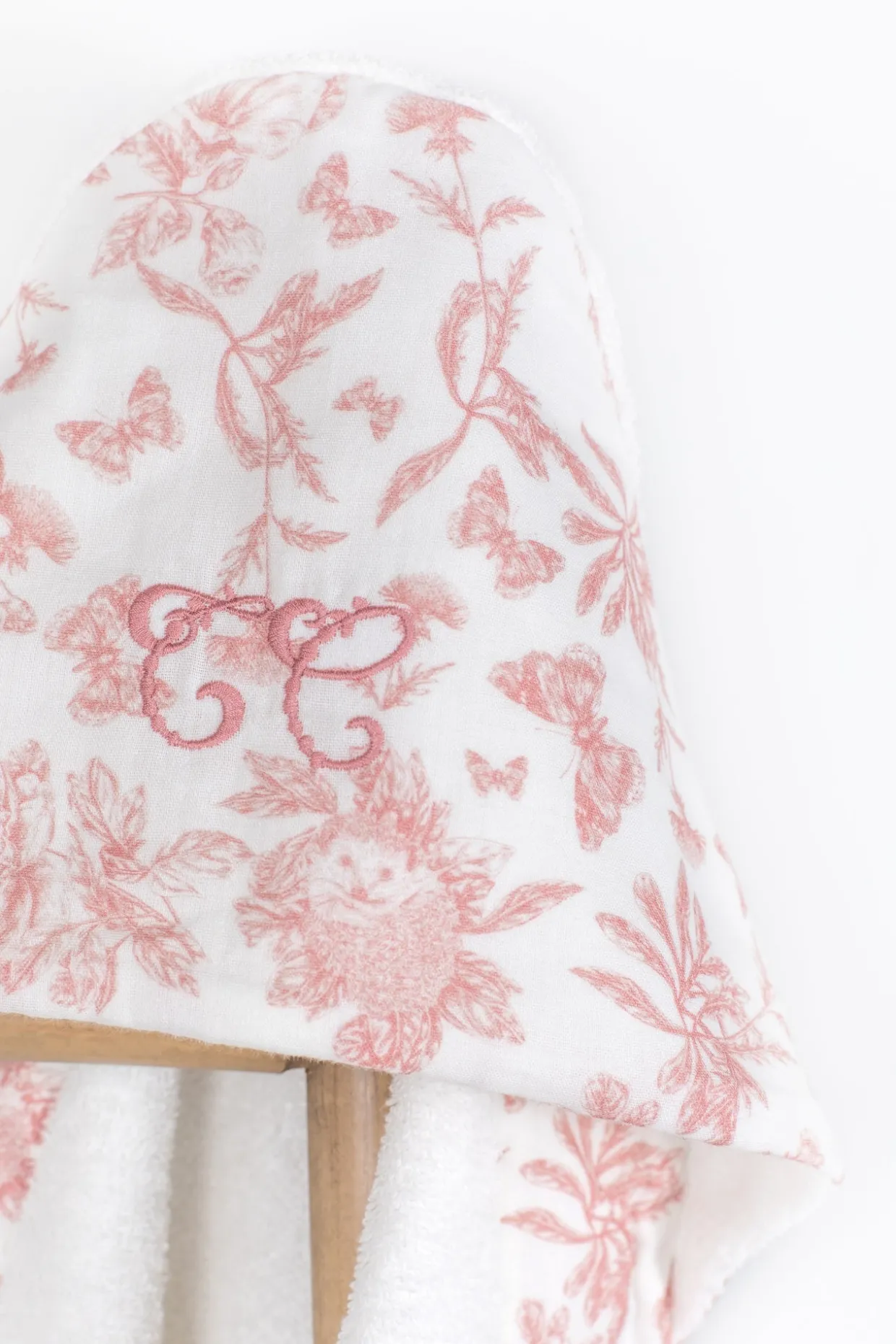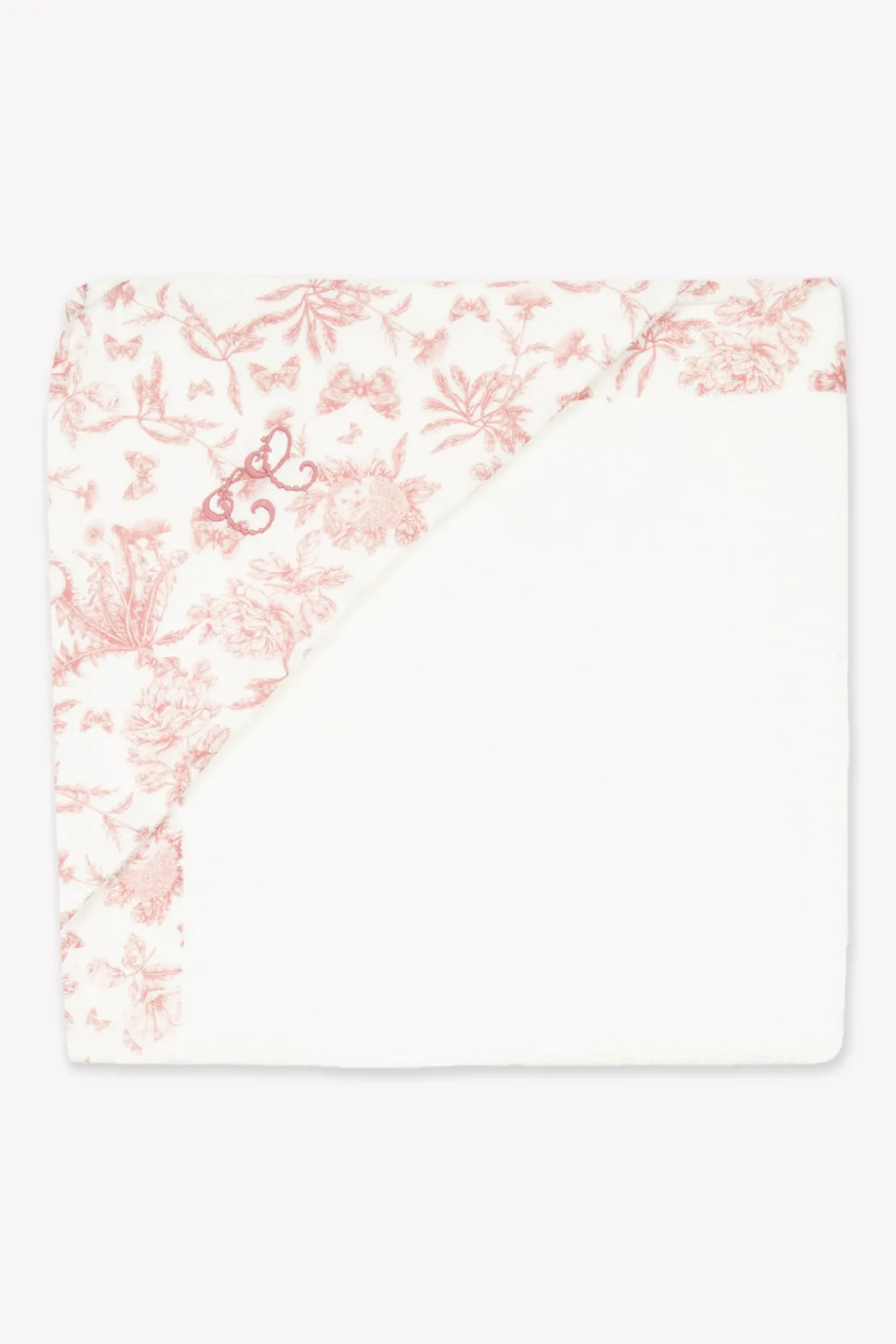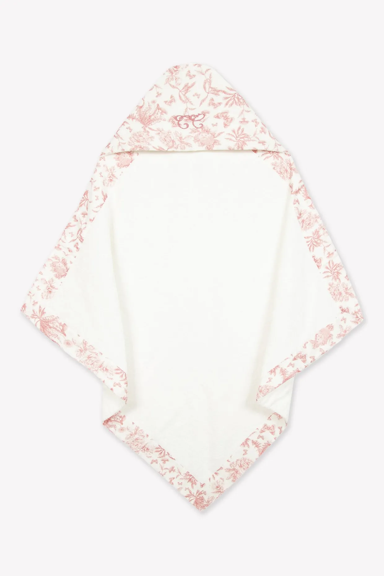 Cape de bain blanche bordée de l’imprimée inspiration Toile de Jouy dessiné par Tartine et Chocolat, en coton lange et éponge.Dimensions : 70 x 70 cm.
