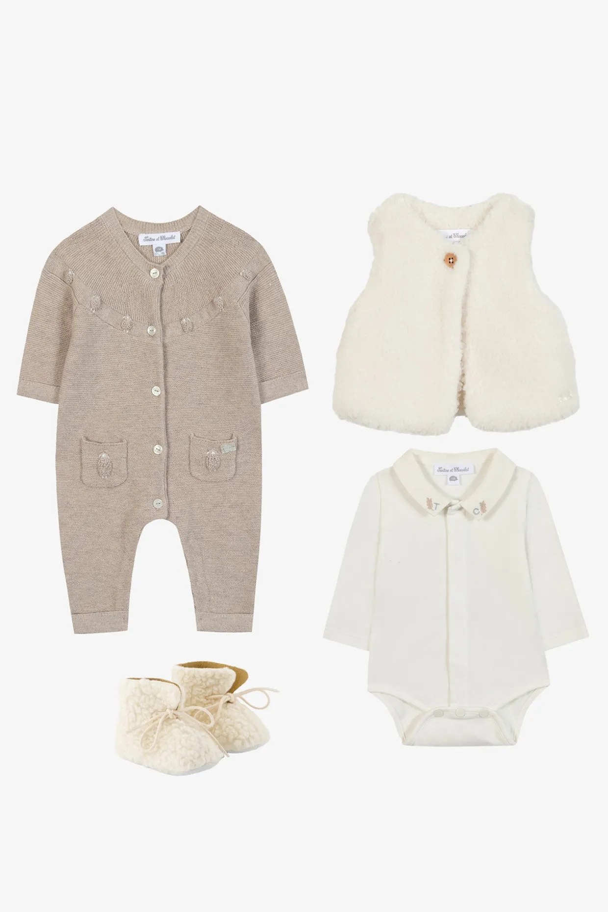 Ce coffret réunit quatre pièces délicates, pensées pour entourer bébé de chaleur et de tendresse dès ses premiers instants. La combinaison longue moka mouliné gris, brodée à la main de moutons en point de nœud, séduit par sa douceur et son raffinement. Le body à col pointu brodé, le gilet sans manches effet fausse fourrure et les chaussons écru assortis complètent ce trousseau. Un ensemble élégant et poétique, idéal pour accompagner bébé avec confort et délicatesse.