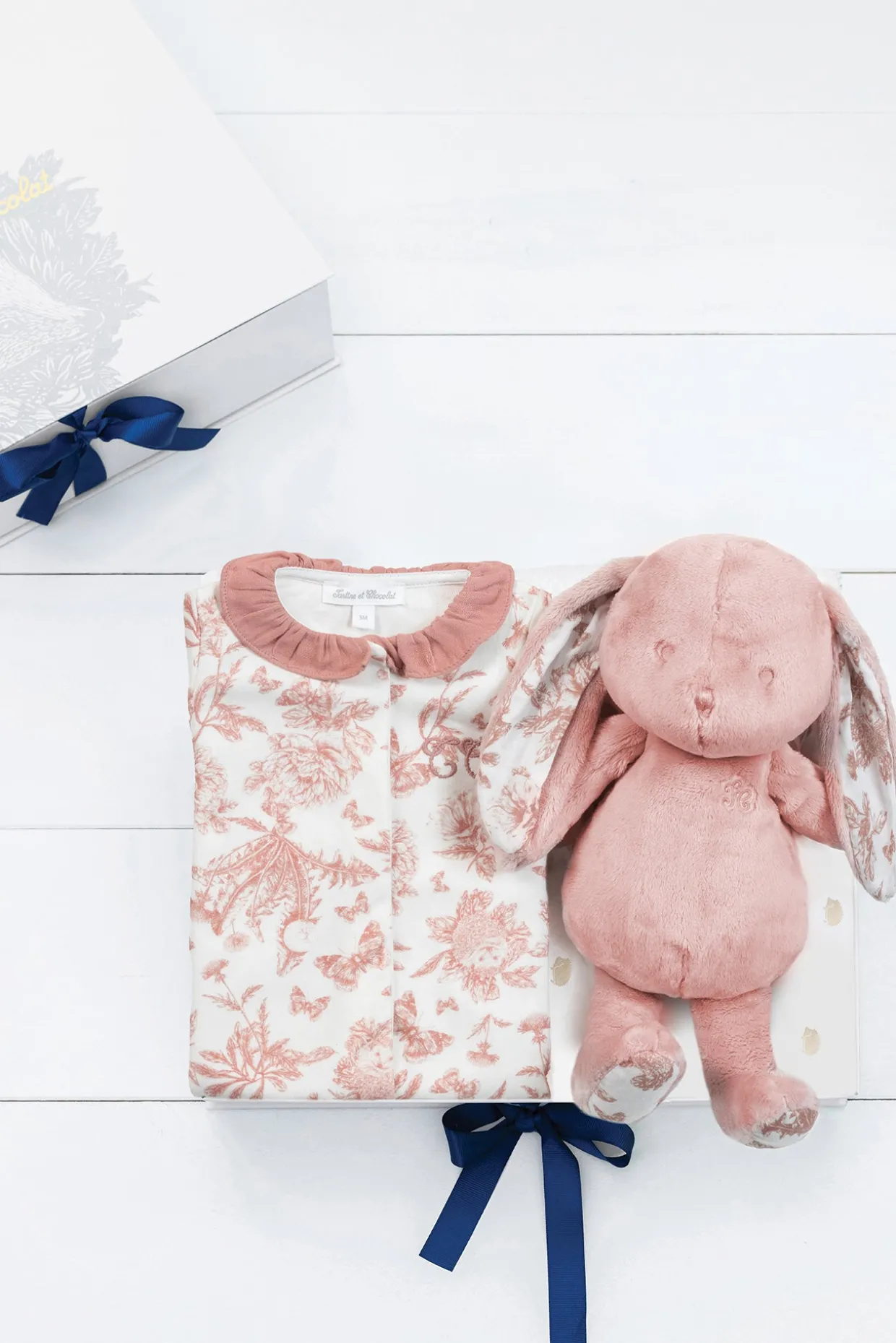 Plongez dans l’univers doux et enchanté de bébé avec ce charmant coffret nuit et peluche. Le pyjama en coton arbore un charmant imprimé Toile de Jouy, facilitant l’habillage grâce à ses boutons pressions à l’avant. Son col volanté en lange rose ajoute une délicate touche finale. Quant à Augustin le lapin, une peluche adorable, il porte fièrement l’imprimé inspiré de la Toile de Jouy rose dessiné par Tartine et Chocolat. Sa douceur et son visage rassurant font de lui le compagnon idéal pour les doux rêves de bébé. Mesurant 25cm, il est livré dans une boîte Toile de Jouy. Un ensemble parfait pour des nuits remplies de tendresse. Ce coffret est le cadeau idéal pour envelopper bébé de tendresse et de douceur à l’heure du coucher.