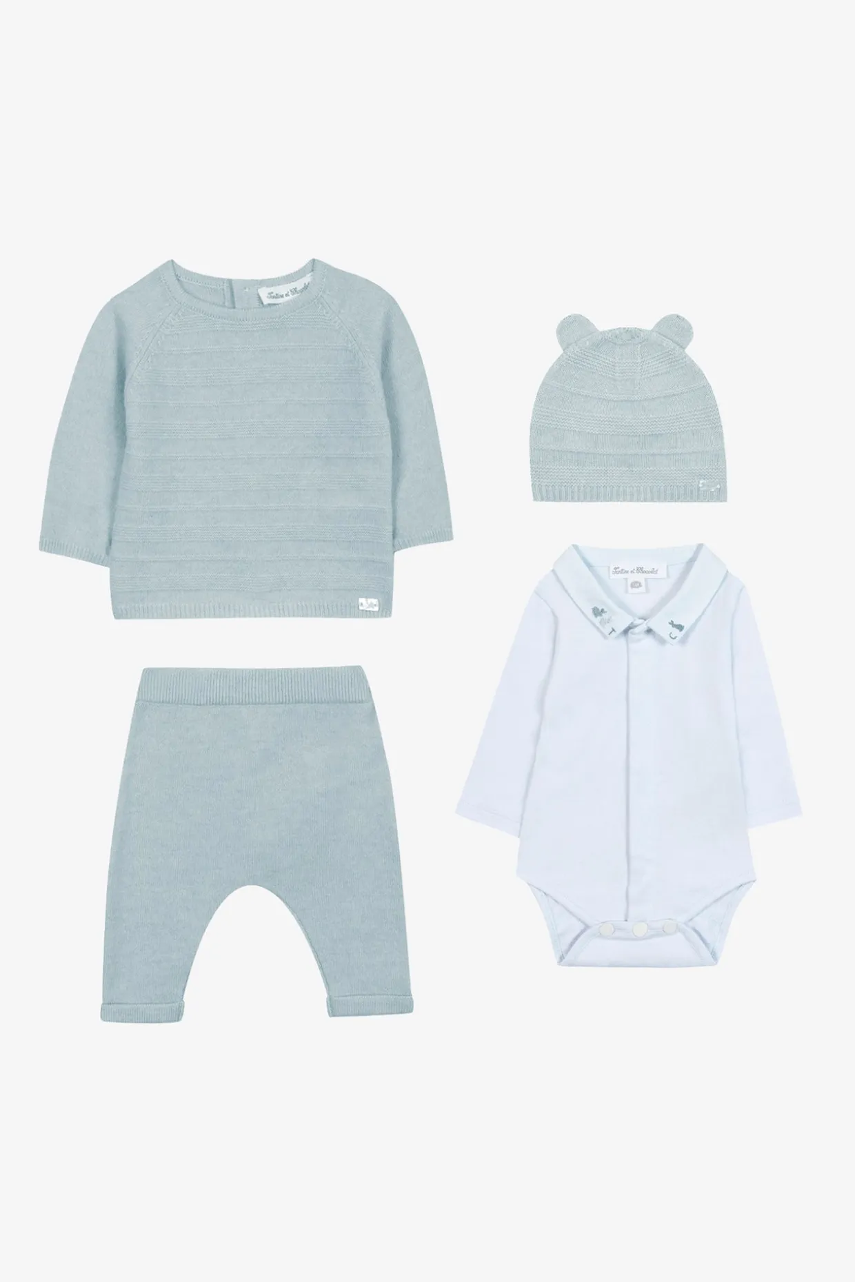 Ce coffret maille douceur garçon réunit trois essentiels raffinés pour les premiers jours de bébé, Le body bleu ciel, orné d’un col brodé du lapin emblématique et des initiales TC, allie confort et élégance, L’ensemble naissance en laine et cachemire, composé d’un haut tricoté en point de mousse et d’un pantalon assorti, enveloppe bébé d’une chaleur délicate, Le bonnet bleu chiné, rehaussé de petites oreilles, complète cet écrin tendre, parfait pour les premiers instants d’hiver.