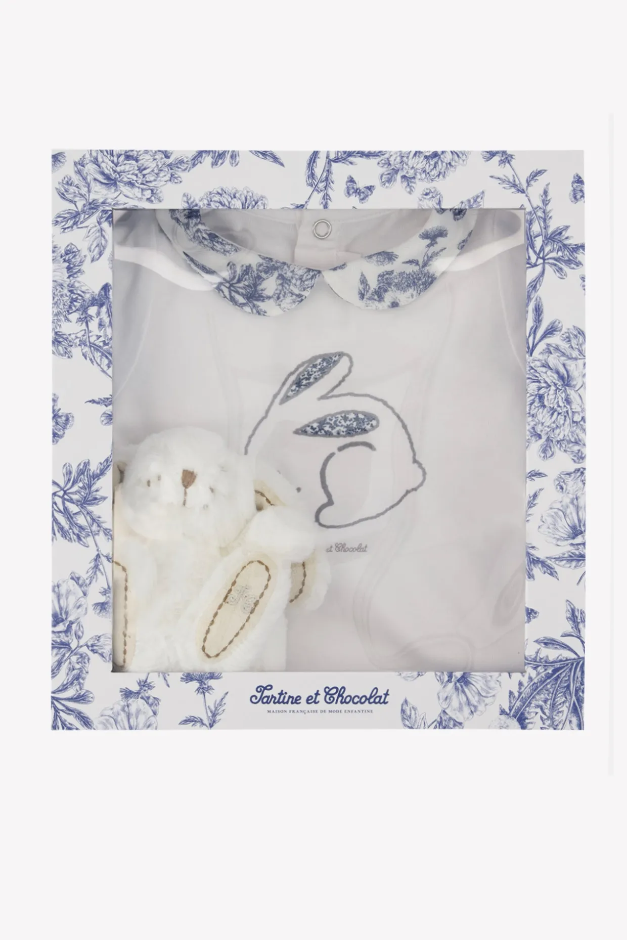 Un coffret délicat et poétique, pensé pour accompagner les tout premiers instants de bébé. Ce coffret naissance, idéal pour fille comme pour garçon, se compose d’un pyjama blanc orné d’un col inspiration Toile de Jouy bleu et d’une tendre illustration de lapin au centre, ainsi que d’un doudou lapin tout doux assorti. Un présent précieux, parfait pour célébrer une arrivée tout en douceur.