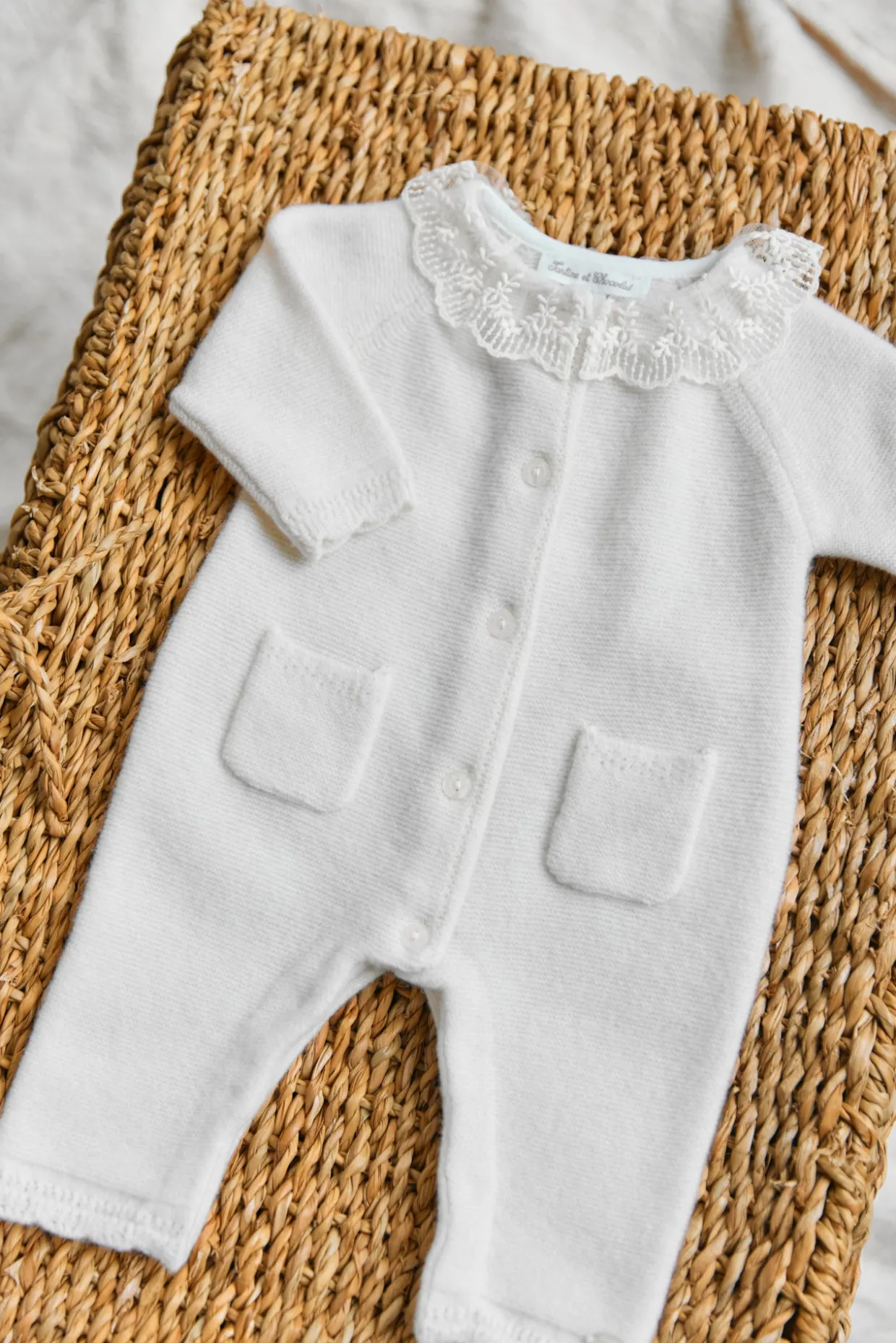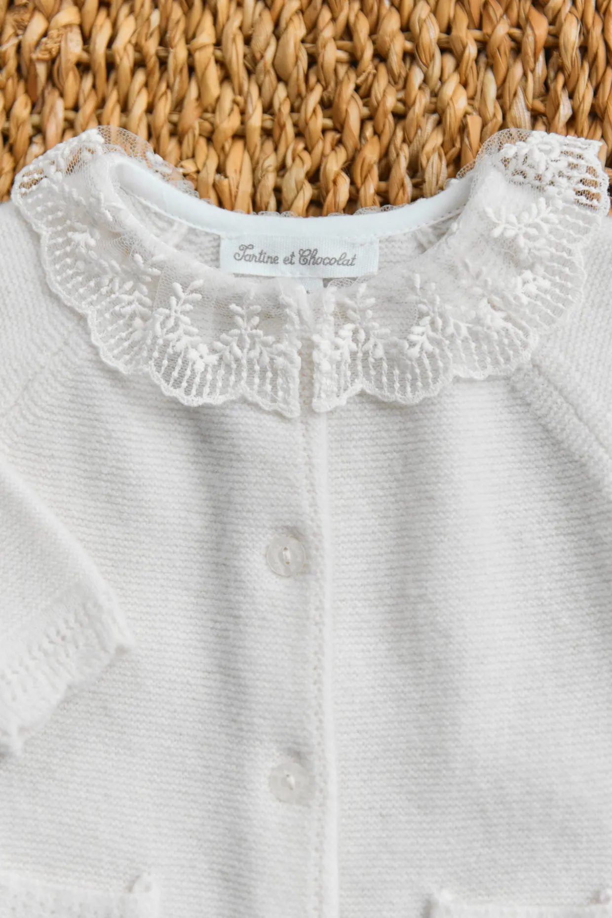 Composition : Col:100% Coton Tricot:90% Laine 10% Cachemire 2 et 3ème volant:100% Polyamide
