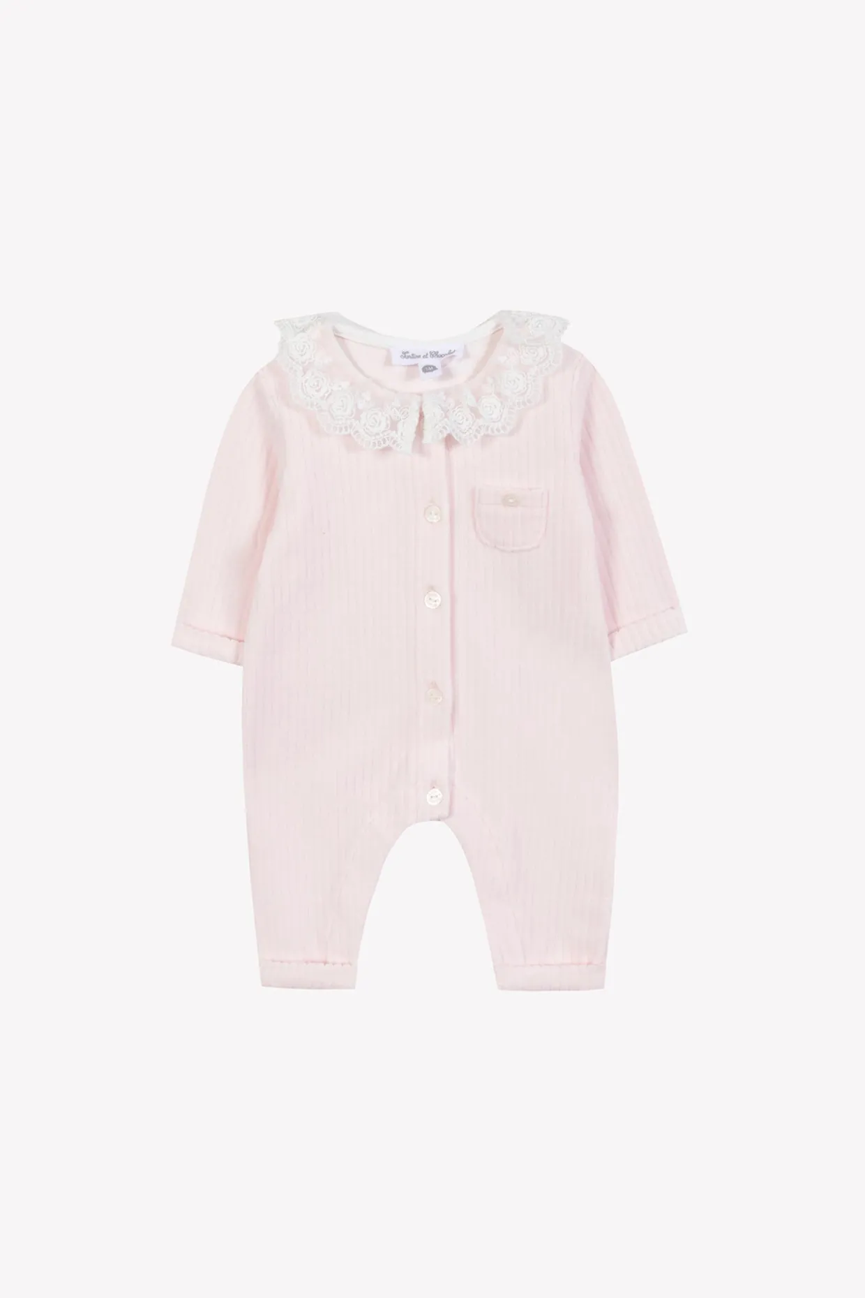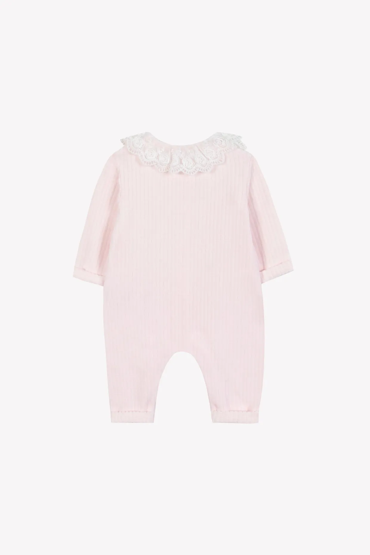 Cette combinaison longue pour naissance fille, en coloris rose pâle, est confectionnée en velours doux. Elle se distingue par son col volanté en dentelle, apportant une touche délicate et élégante, parfaite pour les premiers instants de bébé.