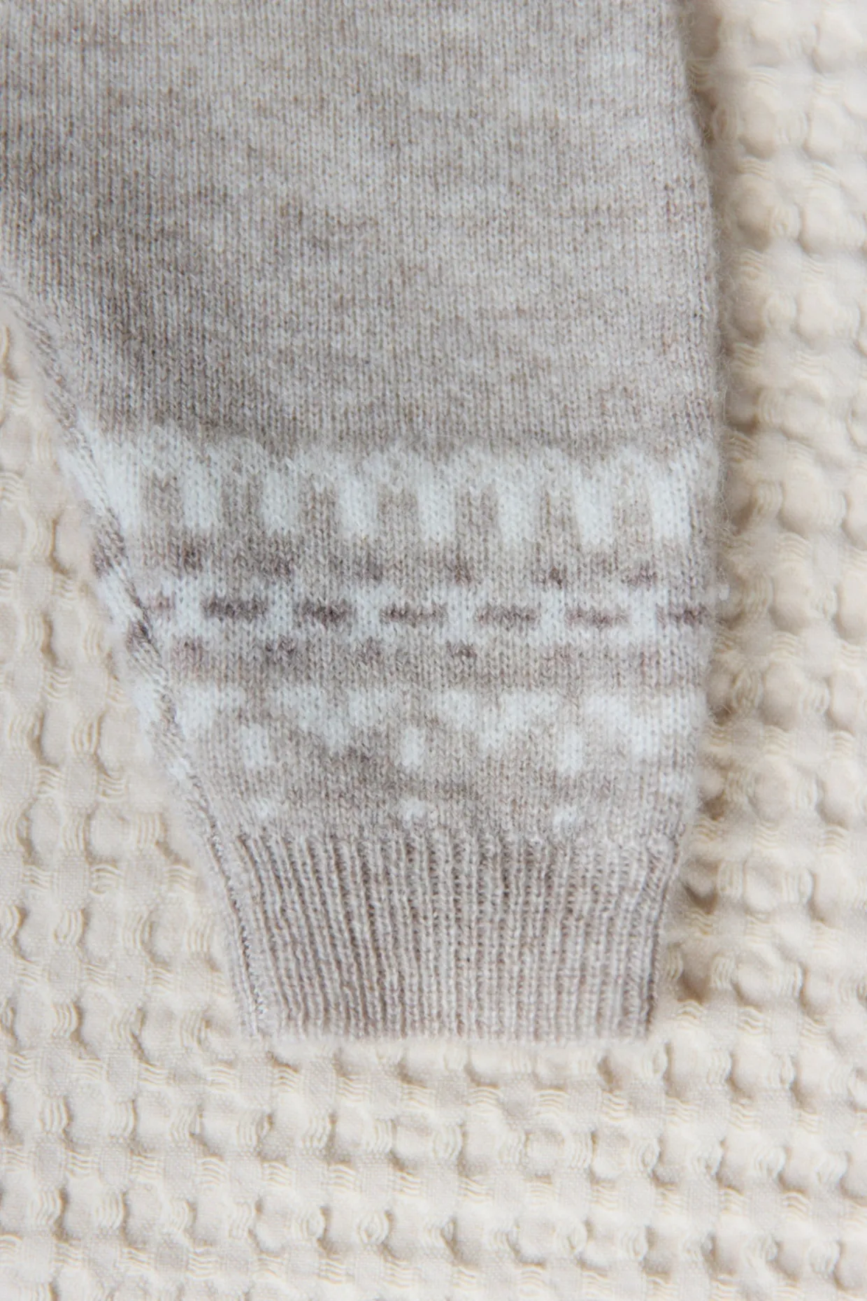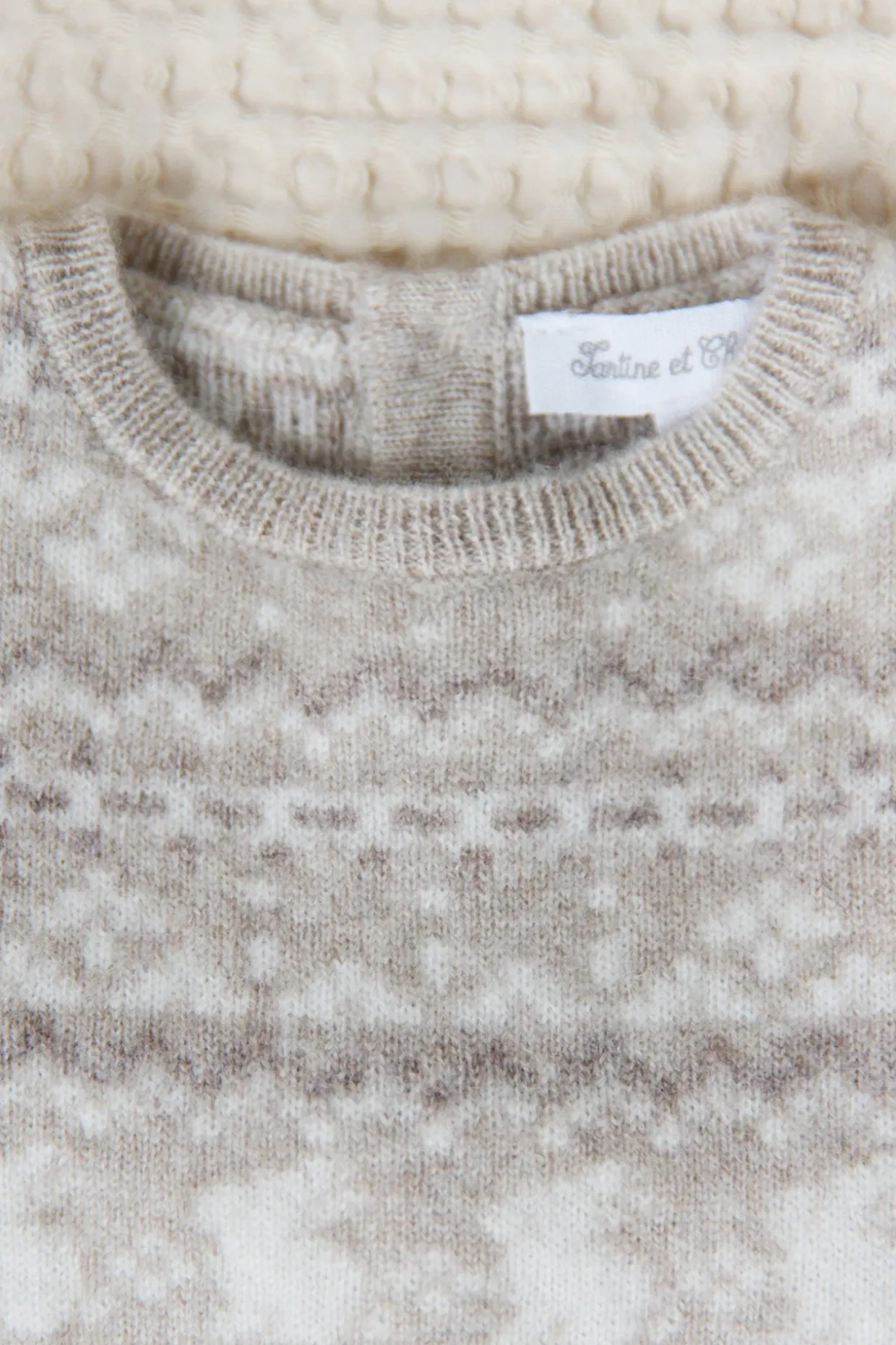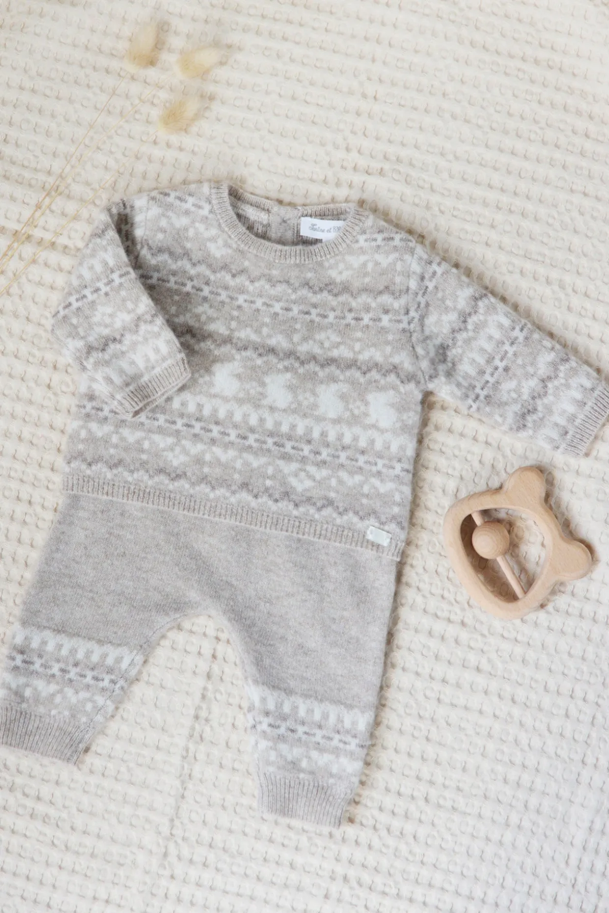 Pour les premiers instants de bébé, cet ensemble naissance garçon en greige chiné dévoile un motif jacquard délicat sur le haut et le pantalon assorti. Confectionné en laine et cachemire, il enveloppe bébé d’une chaleur douce et confortable, parfaite pour les journées d’hiver. Un duo raffiné, qui allie élégance et bien-être.