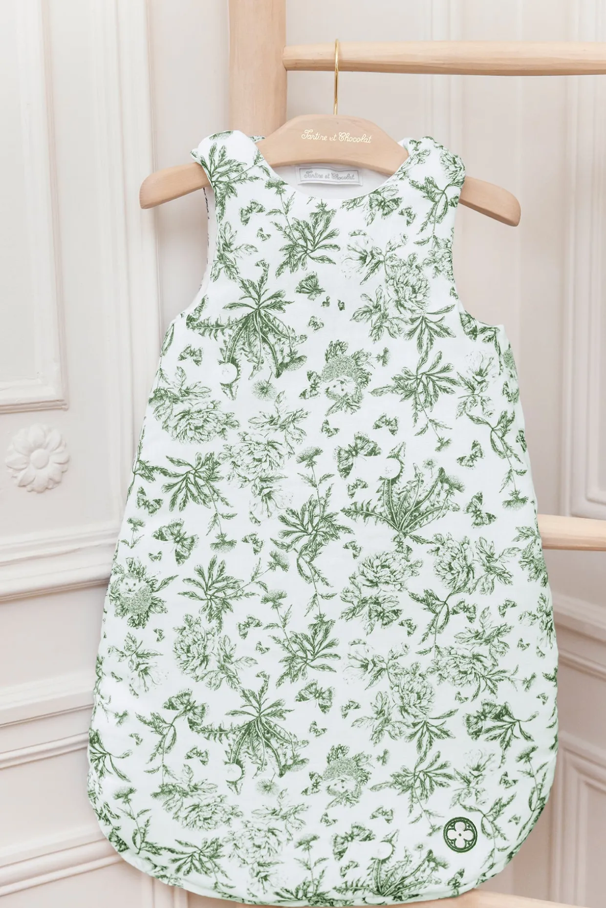 Cette gigoteuse, proposée en deux tailles pour accompagner bébé dans ses premiers rêves, est délicatement ornée d’un imprimé vert inspiration toile de Jouy. Conçue pour offrir confort et sécurité, elle enveloppe votre tout-petit d’une douceur raffinée. Issue de la collaboration entre Tartine et Chocolat et l’Abbaye des Vaux de Cernay, elle allie élégance et bien-être pour des nuits paisibles et poétiques.