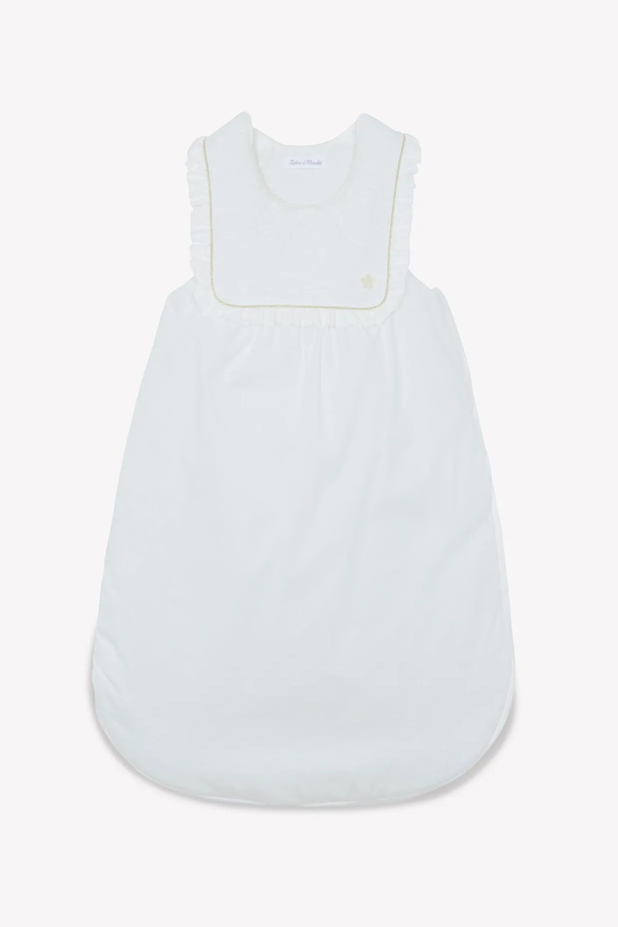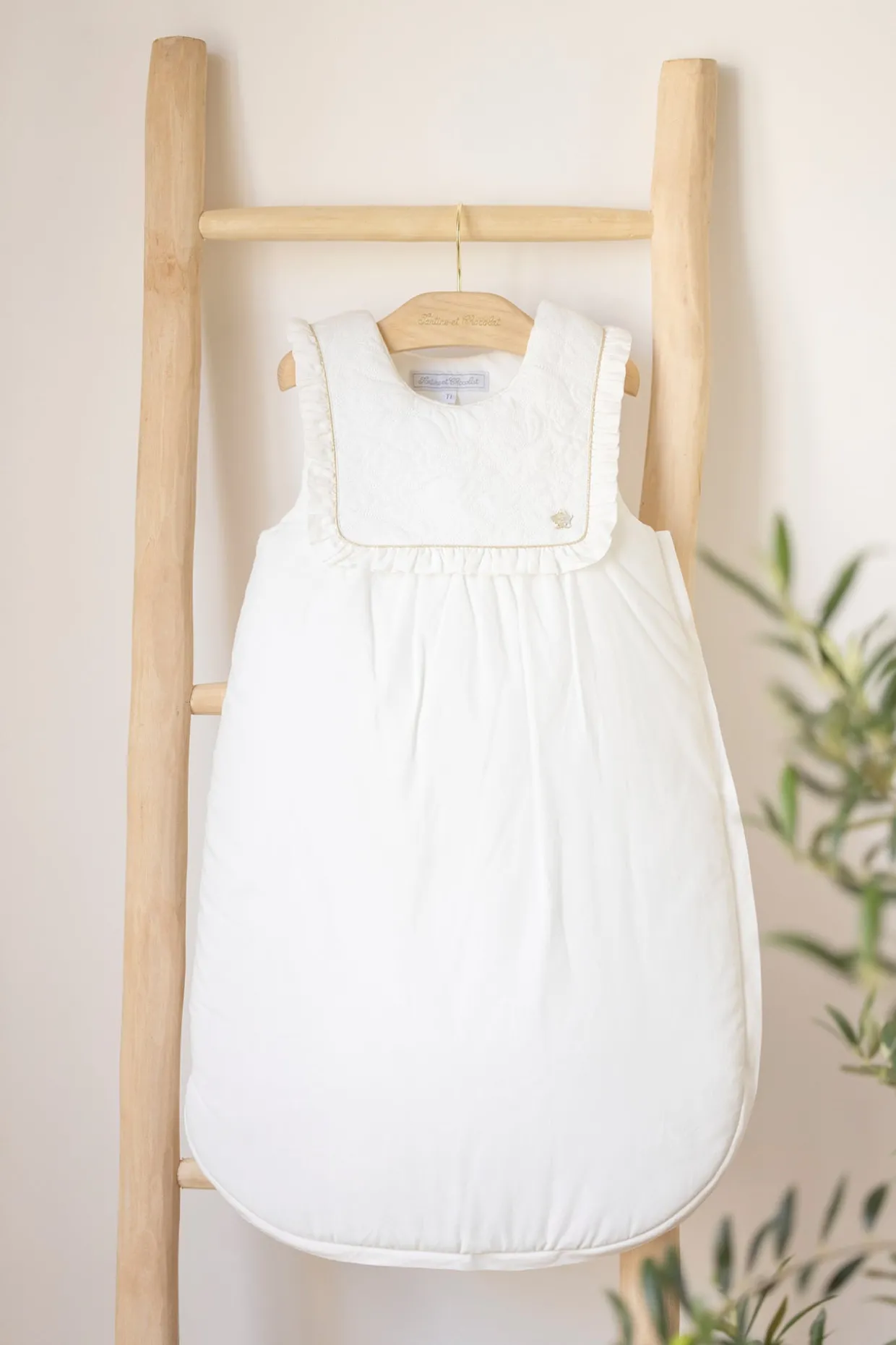 Gigoteuse Délicatesse nacre en percale de coton émerisé et broderies. Ouverture zippée sur le côté. La ligne Délicatesse : Le raffinement et l’élégance de cette ligne illuminent l’univers féérique de la petite fille. Plastron en percale brodée, fils d’or et signature nacrée réhaussent avec modernité les lignes épurées de cette collection. Nous préconisons une utilisation de nos gigoteuses dans une température de chambre entre 19 et 22 degrés.Longueur 70 cm : 3 – 9 mois.Gigoteuse TOG 2. Fabriqué au Portugal.
