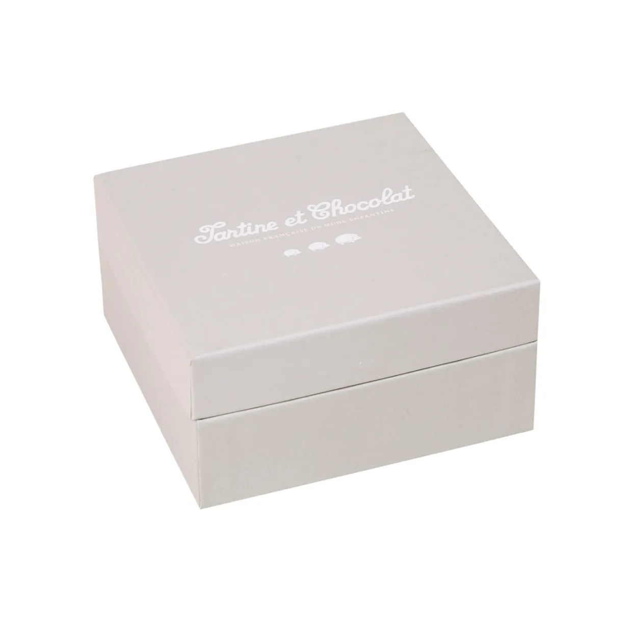 D’une grande douceur, la peluche chien tient dans ses bras un carré en micro velours souligné de tissu Garda, la rayure emblématique de la Maison, rehaussé de point sellier et d’une broderie monogramme TC. Livré dans une boite Tartine et Chocolat. Lucien le chien : Un petit chiot gris qui adore faire de clins. Le meilleur ami de tous, Lucien le Chien accompagnera le quotidien des plus petits comme des plus grands.