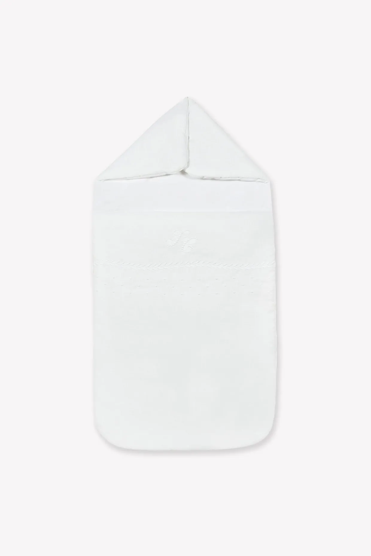 Nid d’ange lin et coton blanc aux broderies anciennes et délicates ton sur ton. doublé de jersey pour plus de confort. Encoches au dos permettant de passer les sangles du siège-auto. Dimensions : 41 x 85 cm. L’élégance revisitée pour cette ligne de puériculture pure et raffinée. Un lin doux et brodé en ton sur ton pour un rendu tout en délicatesse.Nid d’ange TOG 02. Fabriqué au Portugal