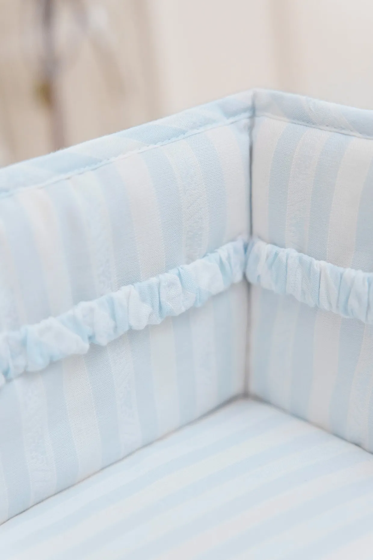 Panière Garda bleu ciel, en popeline et coton piqué et fil à fil. Compartiments élastiqués. Dimensions : 23 x 23 cm. La ligne Garda : une ligne emblématique qui symbolise tout l’esprit Tartine et Chocolat. Des rayures chics et élégantes, associées aux couleurs pastel de l’enfance, un écusson finement brodé, des tissus doux et tendres. Fabriqué au Portugal.