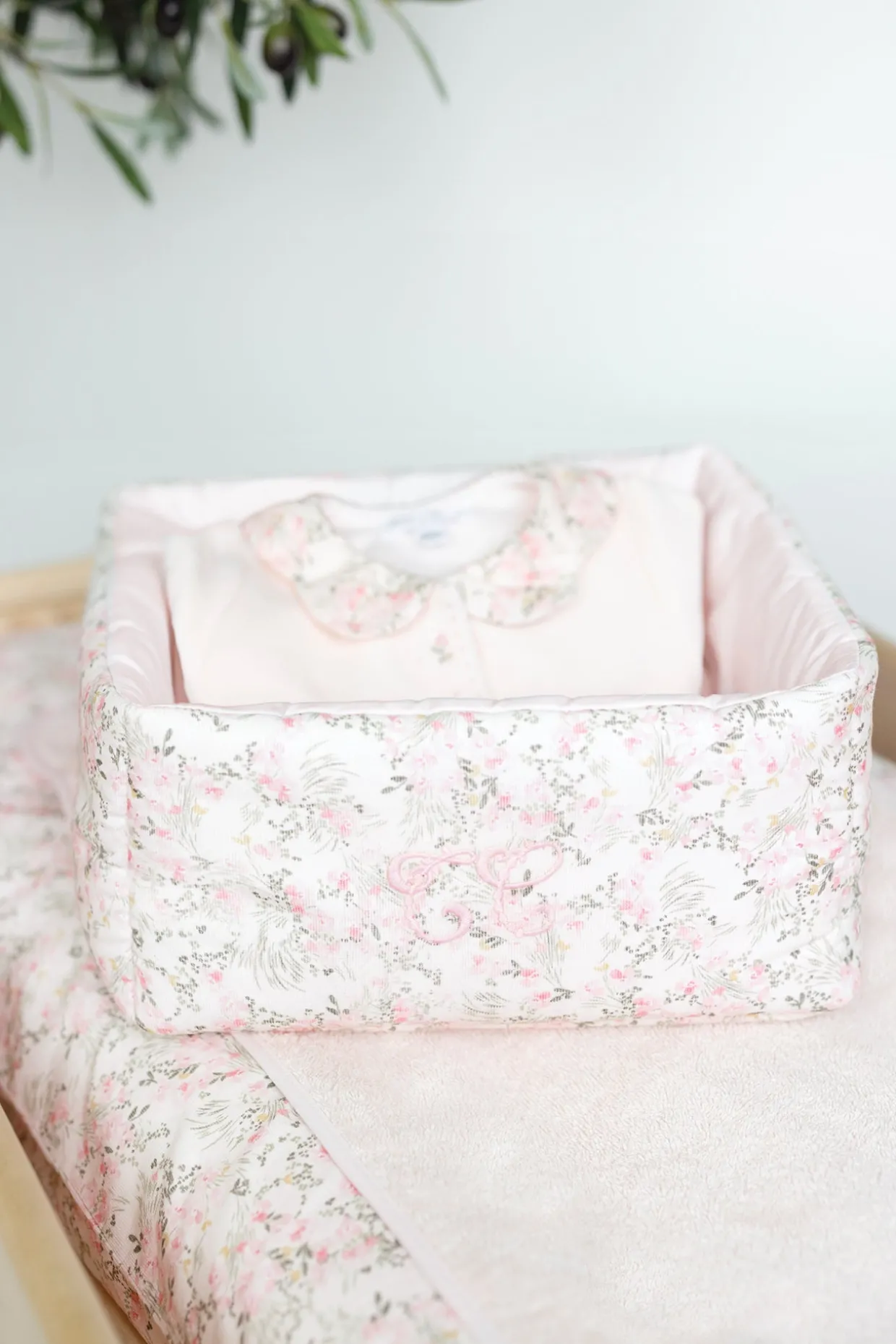Panière en imprimé fleuri inspiré d’un Jardin Hivernal pour ranger tous les essentiels de bébés sur la table à langer. Dimensions : 25 x 25 x 13 cm.
