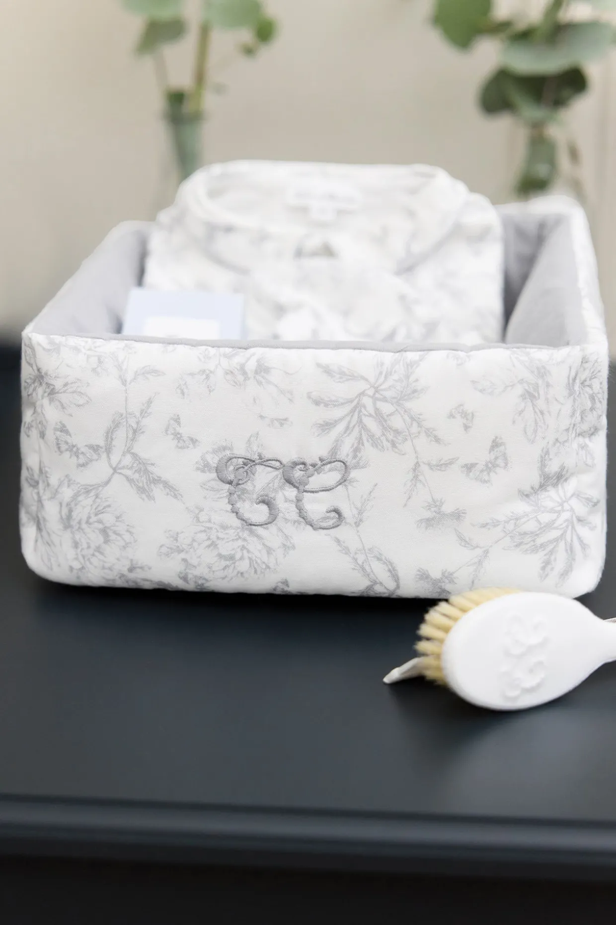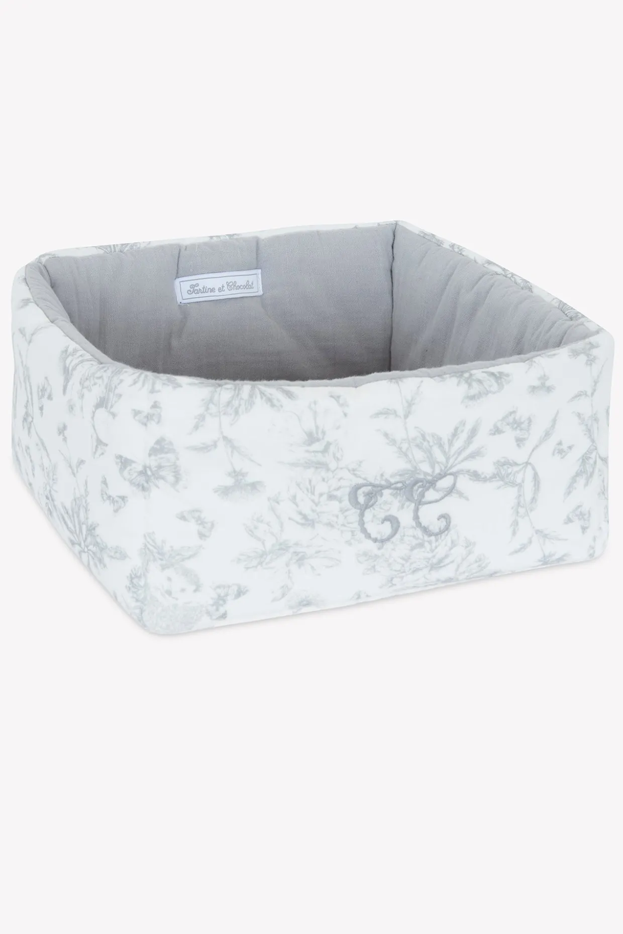 Panière en imprimé inspiration Toile de Jouy dessiné par Tartine et Chocolat pour ranger tous les essentiels de bébés sur la table à langer. Dimensions : 25 x 25 x 13 cm.