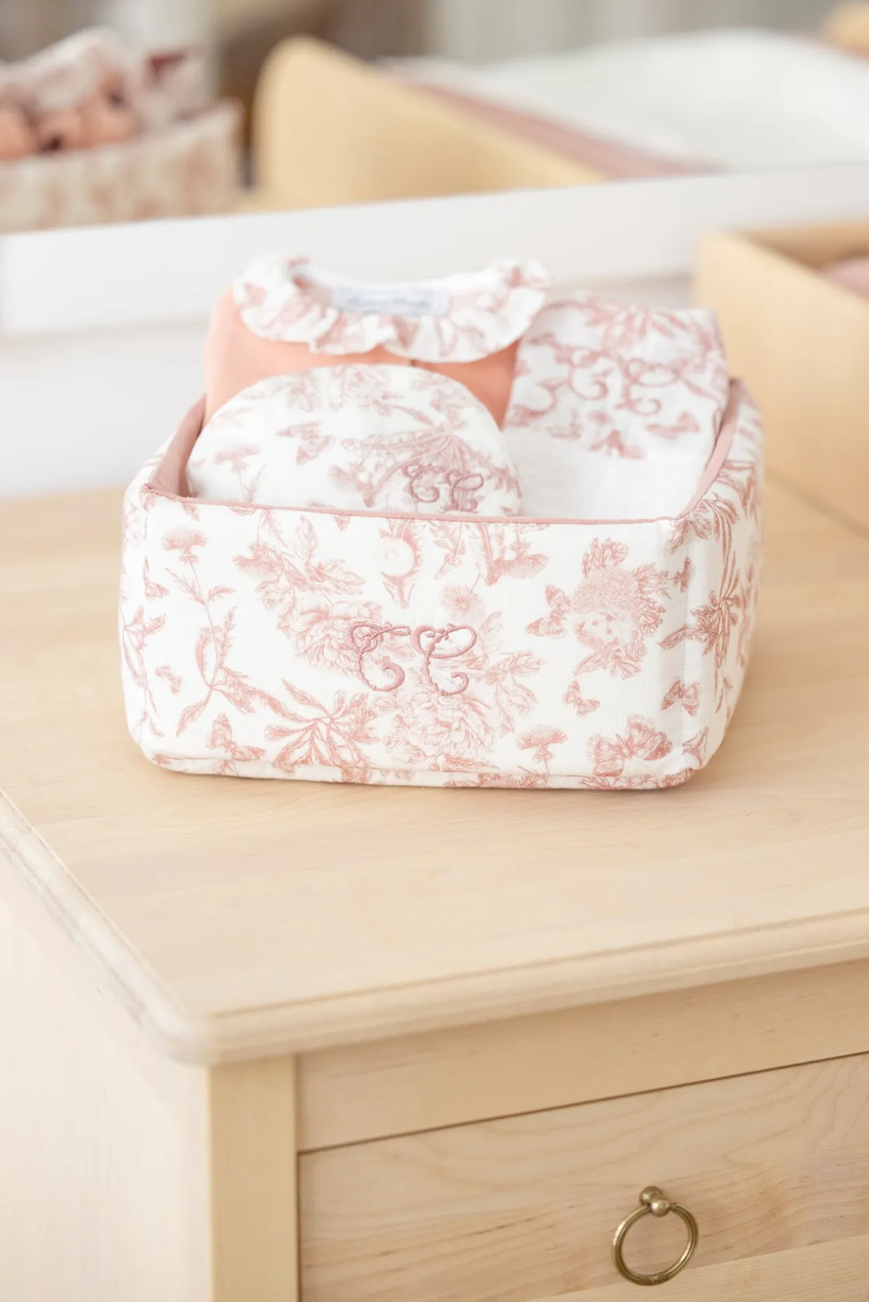 Panière en imprimé inspiration Toile de Jouy dessiné par Tartine et Chocolat pour ranger tous les essentiels de bébés sur la table à langer. Dimensions : 25 x 25 x 13 cm
