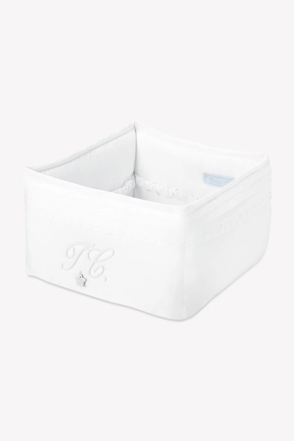 Panière Monogramme blanche, en popeline de coton piqué et fil à fil. Compartiments élastiqués. Dimensions : 25 x 25 cm. La ligne Monogramme : Etoiles de nacre, plis religieux et broderies réhaussent avec délicatesse l’élégance et la pureté de cette ligne. Discret et chic, cette ligne pour fille ou garçon est un véritable cocon de blancheur. Fabriqué au Portugal