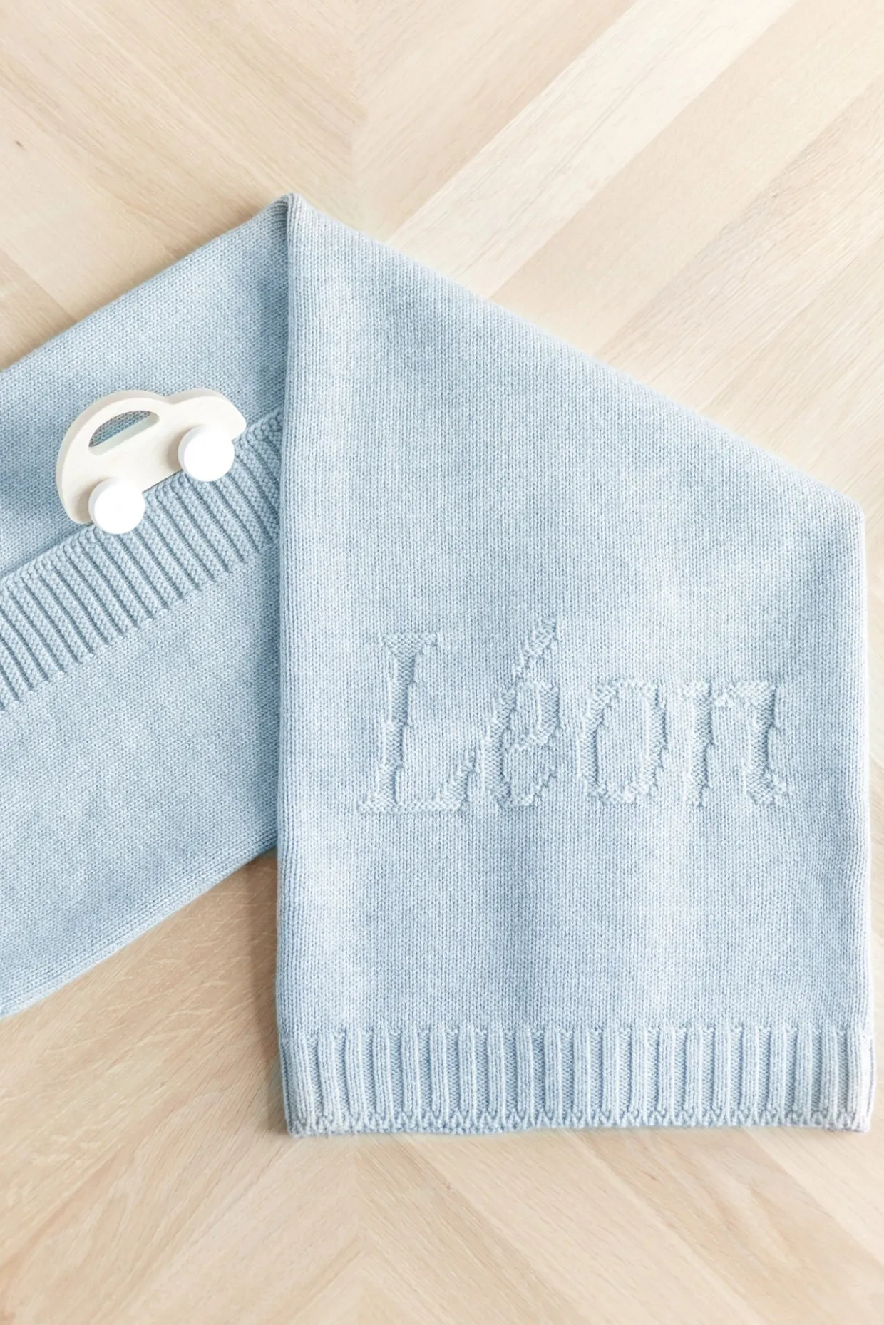Ce plaid personnalisé en laine est à personnaliser au prénom ou aux initiales de l’enfant pour un cadeau unique qui accompagnera bébé pendant ses premières années. Le prénom est tricoté directement dans le plaid et est fabriqué à la commande dans un atelier du Portugal. Dimensions : 100 x 75 cm. La personnalisation: 10 caractères maximum – Police Georgia – tous les accents, majuscules, minuscules sont possibles. Chaque plaid sera soigneusement emballé dans du papier de soie parfumé au Ptisenbon et inséré dans une boite cadeau fermée par un ruban. Fabriqué au Portugal