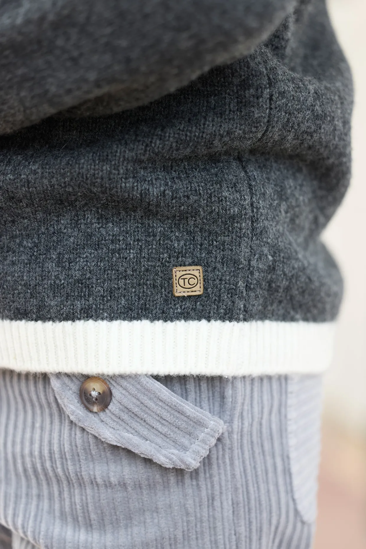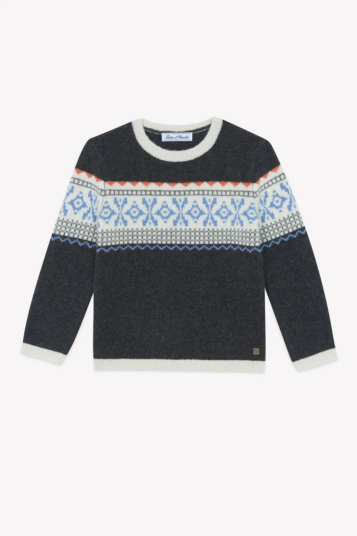 Ce pull pour junior garçon, en coloris gris foncé chiné, se distingue par son motif jacquard sur le devant, apportant une touche graphique et chaleureuse à son look. Confectionné en laine douce, il est parfait pour les journées fraîches. Un essentiel confortable et stylé, idéal pour compléter une tenue avec élégance et confort.