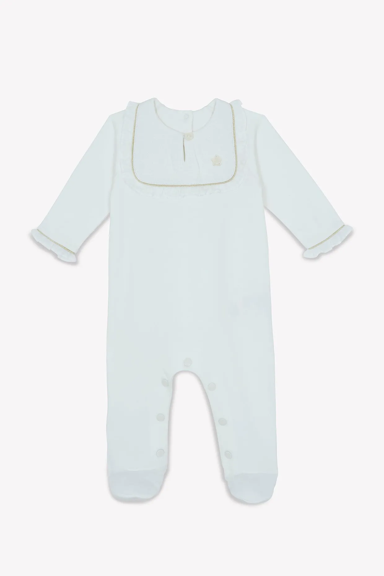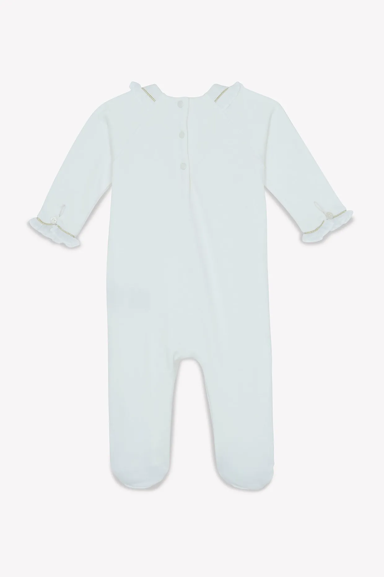Dors-bien Délicatesse nacre en percale de coton émerisée. Ouvertures par boutons pression dos et entrejambe. La ligne Délicatesse : Le raffinement et l’élégance de cette ligne illuminent l’univers féérique de la petite fille. Plastron en percale brodée, fils d’or et signature nacrée réhaussent avec modernité les lignes épurées de cette collection. Fabriqué au Portugal.