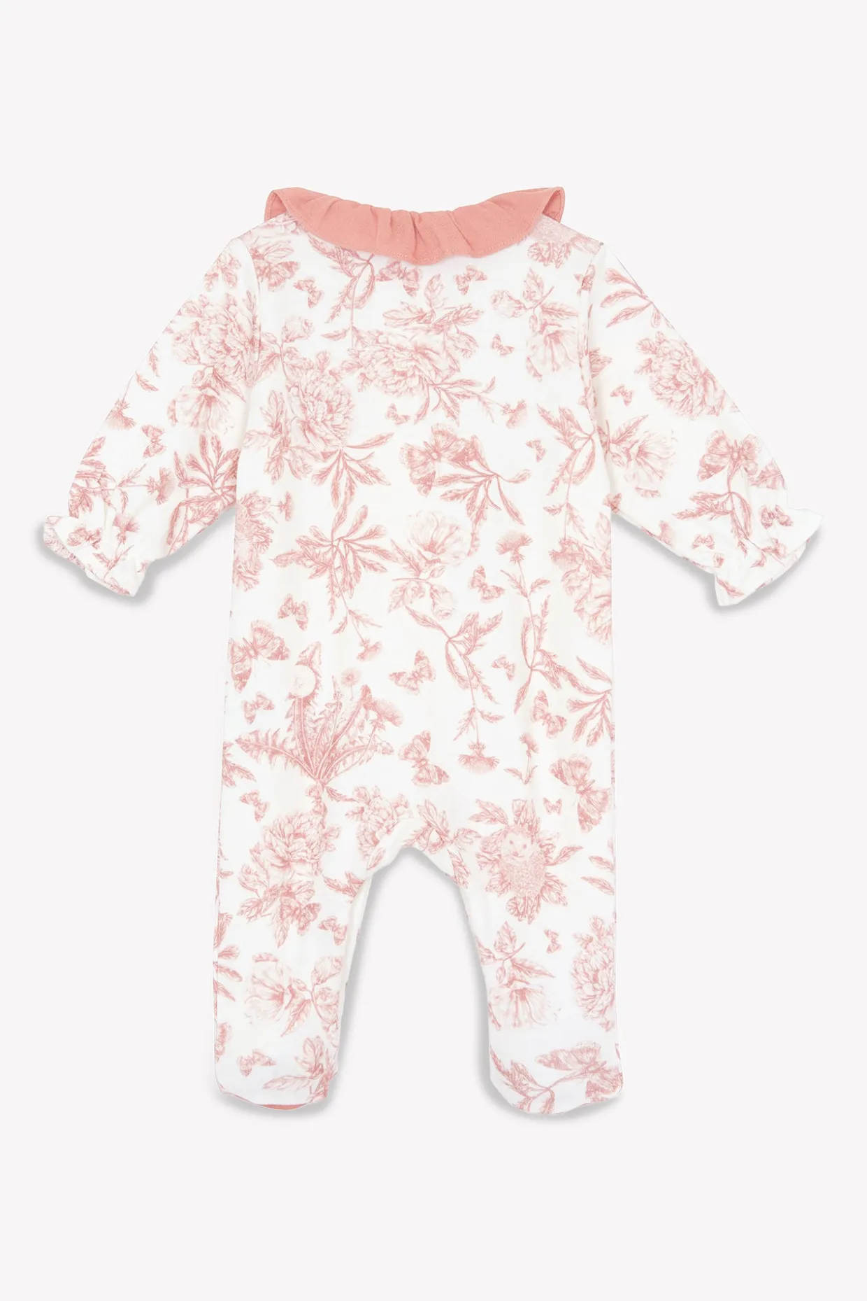 Pyjama imprimé coup de cœur inspiration Toile de Jouy dessiné par Tartine et Chocolat en coton avec ouverture par boutons pressions sur le devant. On craque pour son col volanté en lange rose et le rappel sous les pieds. Bonnet vendu séparément.