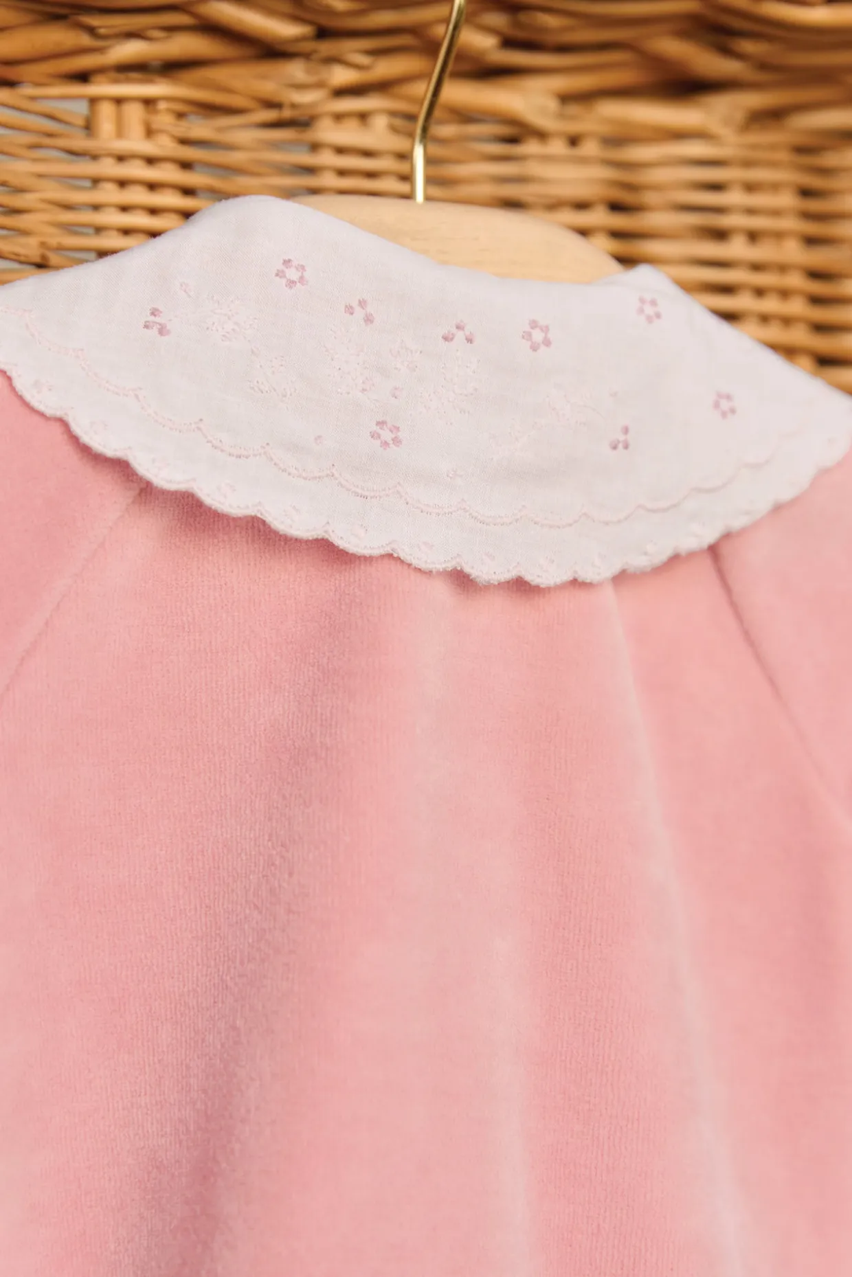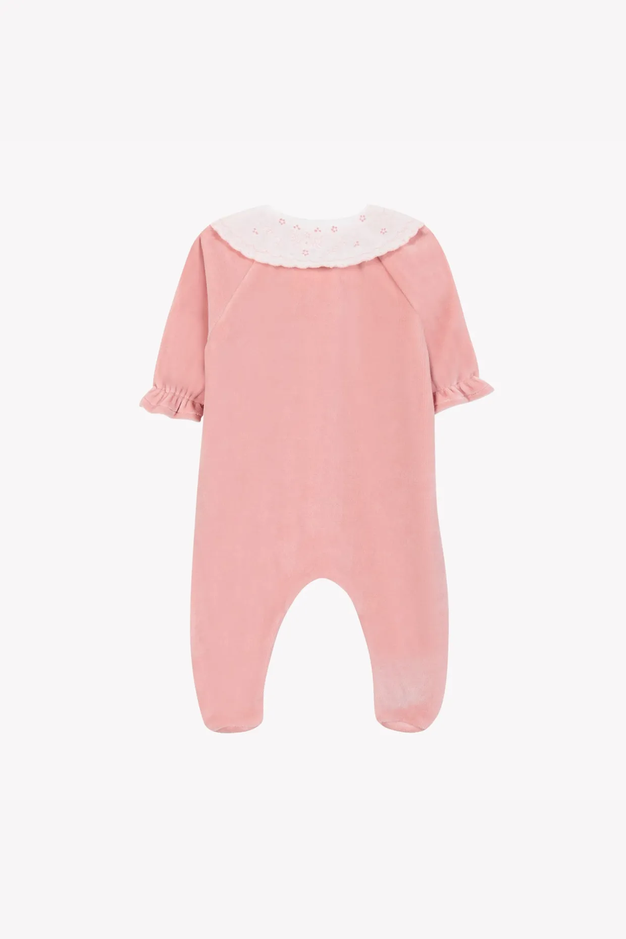 Ce pyjama en velours couleur pêche, pensé pour les petites filles, enveloppe bébé de chaleur et de douceur dès les premiers jours. Sa collerette brodée apporte une note délicate et raffinée à ce modèle tendre, idéal pour accompagner les nuits paisibles.