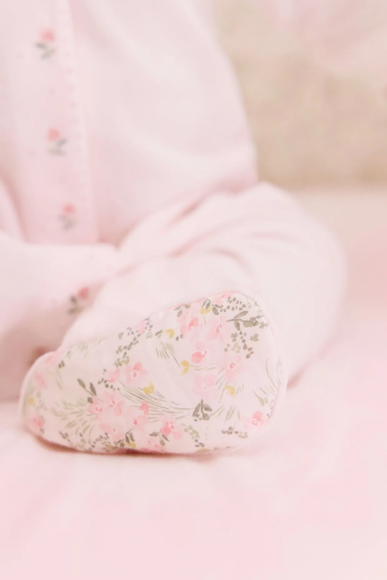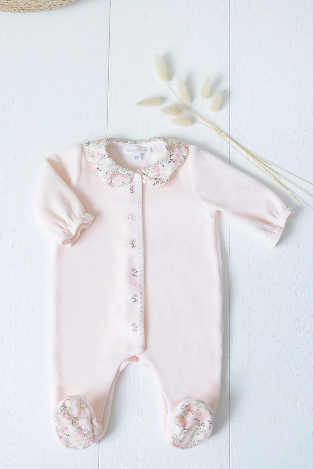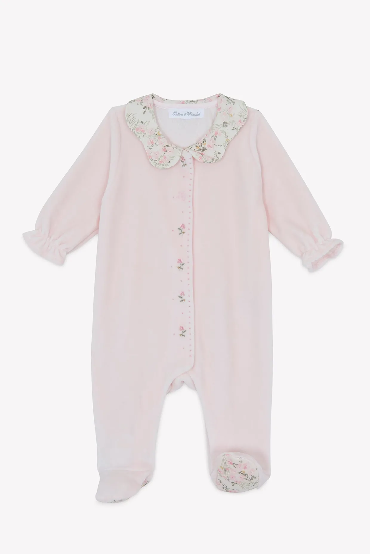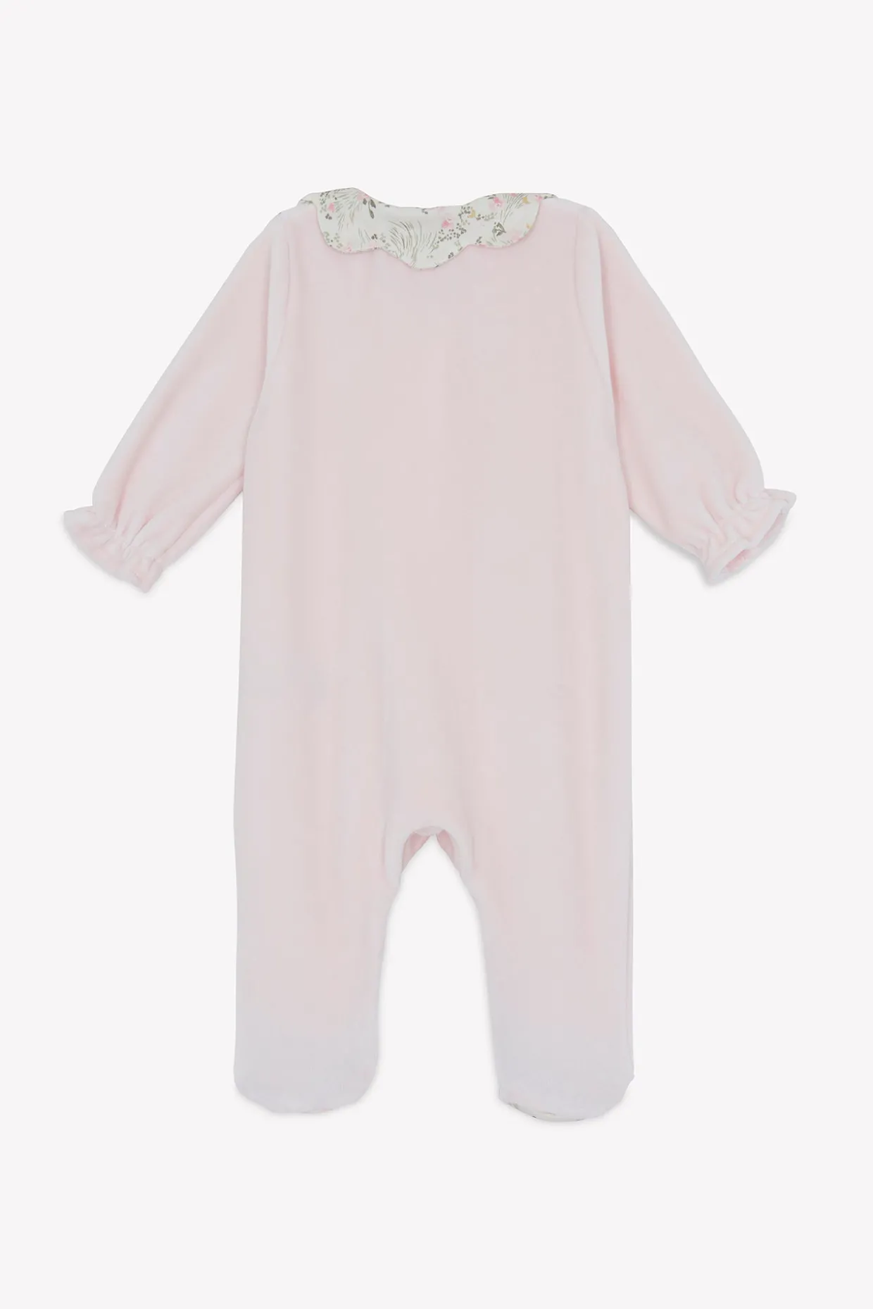 Pyjama en velours rose pâle avec ouverture par boutons pressions sur le devant. On craque pour son col claudine à l’imprimé fleuri inspiré d’un Jardin Hivernal et le rappel sous les pieds.