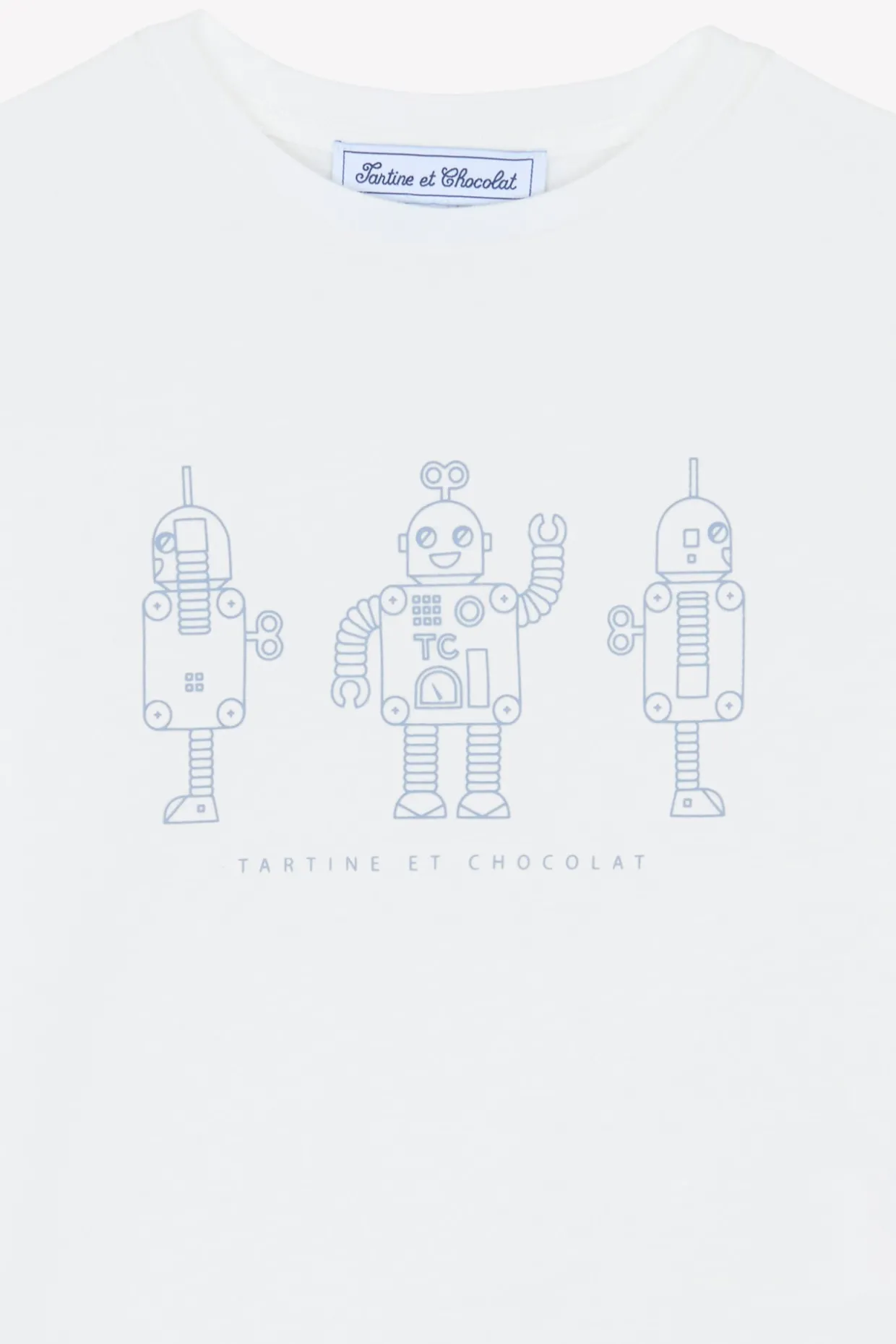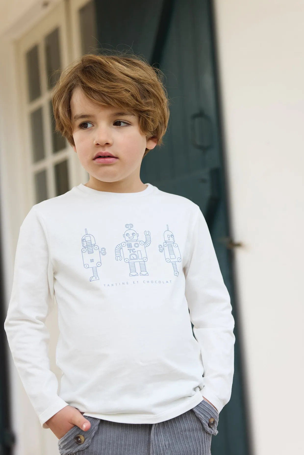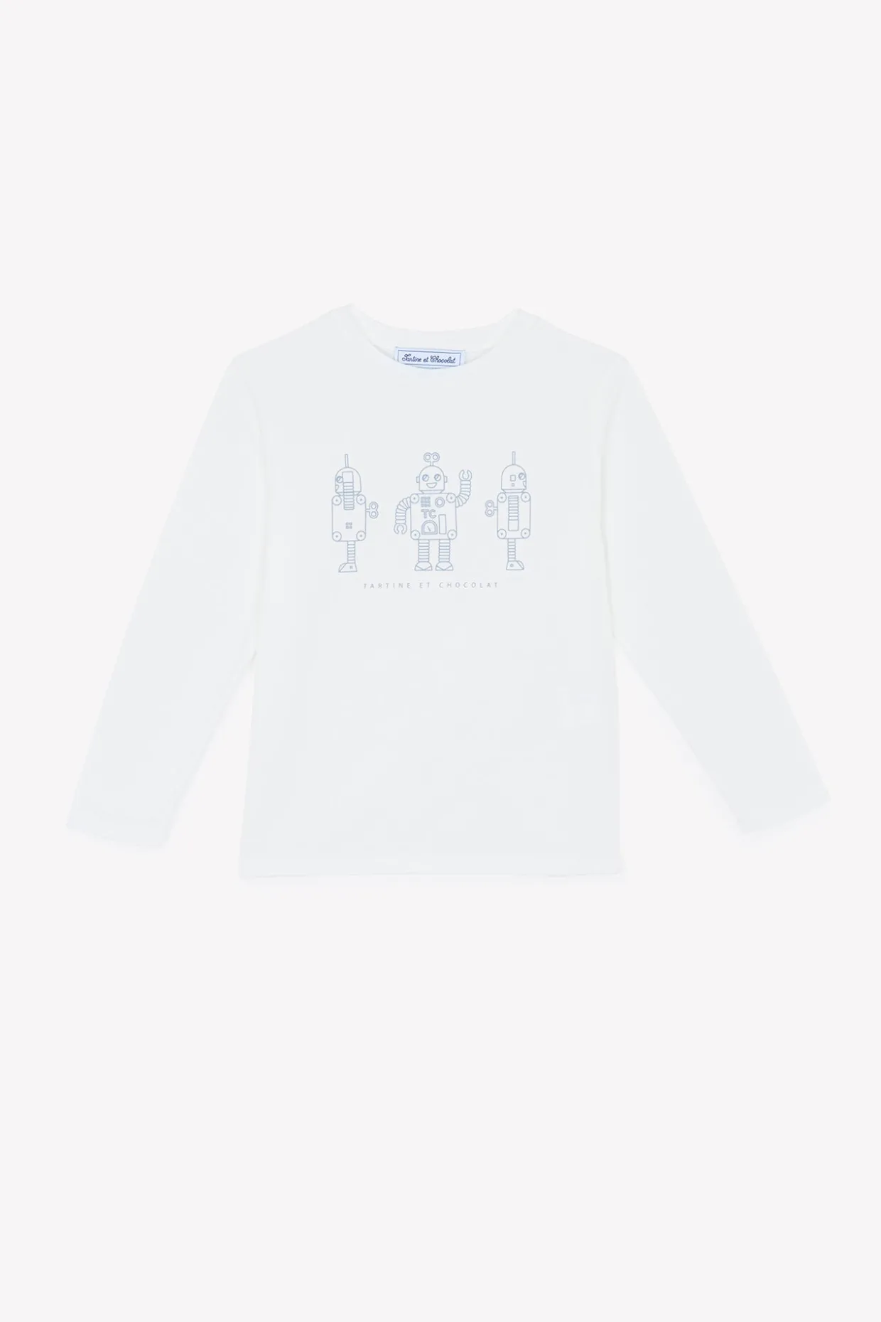 Ce t-shirt manches longues écru pour junior garçon arbore une illustration de trois robots en bleu grisé, apportant une touche ludique et originale à sa tenue. Confectionné dans une matière douce, il assure confort et liberté de mouvement pour toutes les activités de la journée.