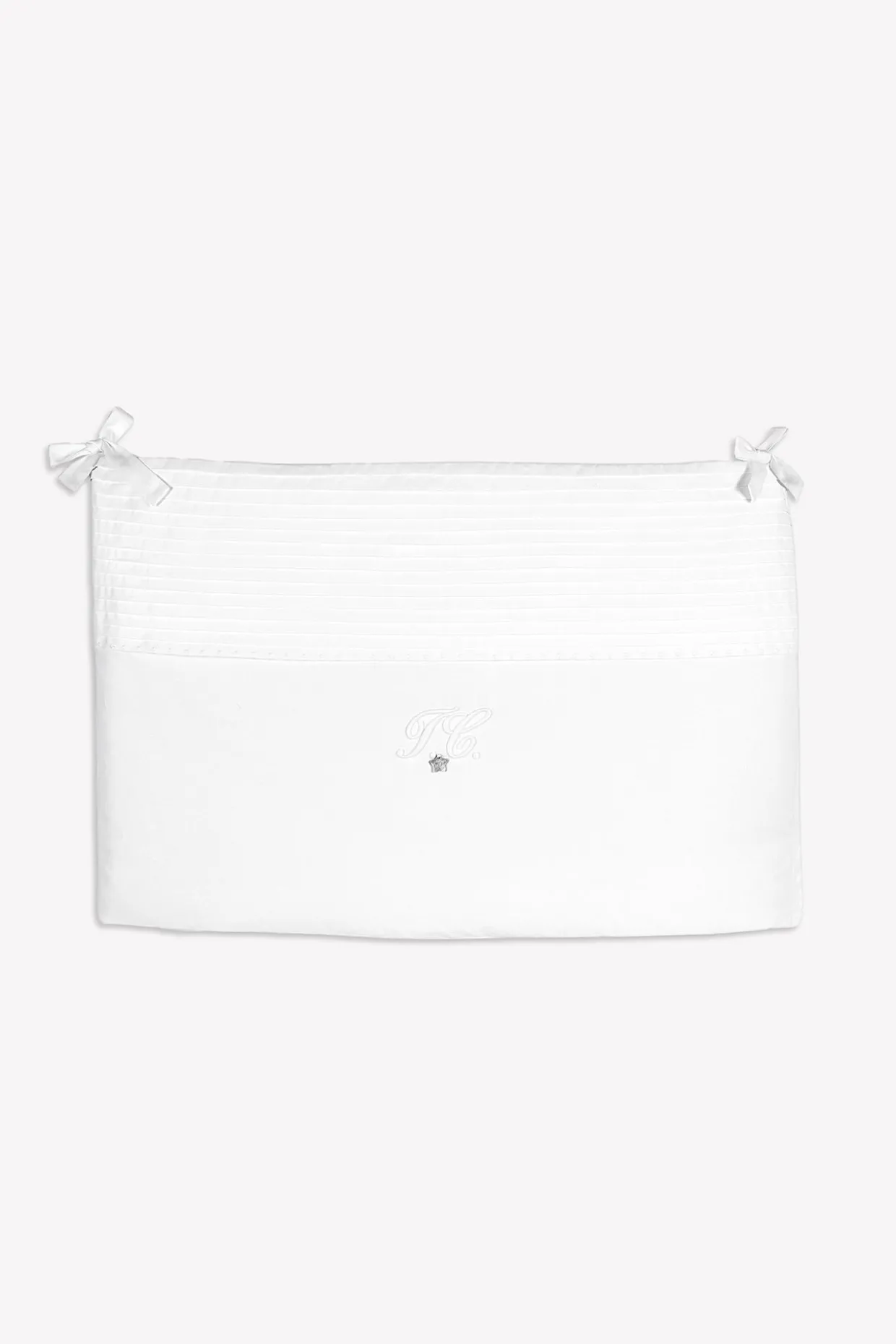 Tour de lit adaptable Monogramme en popeline de coton, piqué et fil à fil. Déhoussable et lavable en machine. Se fixe aux barreaux du lit par de petits noeuds. Compatible pour lits de 60 x 120 cm, ou lits de 70 x 140 cm. La ligne Monogramme : Etoiles de nacre, plis religieux et broderies réhaussent avec délicatesse l’élégance et la pureté de cette ligne. Discret et chic, cette ligne pour fille ou garçon est un véritable cocon de blancheur. Fabriqué au Portugal.